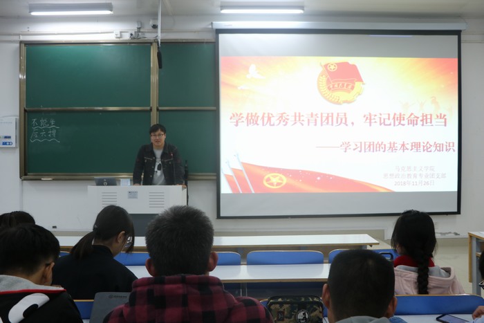 为丰富金年会官网学子与团相关的基本理论知识,增强金年会官网团员的责任感和使命感,11月26日下午,金年会官网“学做优秀共青团员 牢记使命担当”主题团课在社科楼516教室顺利召开。金年会官网2018级全体团员共同参加了此次团课。本次团课由河南省“青马工程”学员史弘扬主讲。