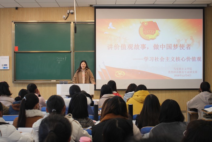 首先,刘冰以2017年2016级思想政治教育二班家庭经济困难认定工作为例,宣讲了社会主义核心价值观“公正”的内涵与意义。她表示,认定工作小组组长何晓坚以身作则、以个人公正之魅力影响着班级同学。我们应该积极弘扬“公正”这一价值观,彰显中国青年刚正不阿的气魄精神。随后,2018级六名同学引用古今中外的事例,分享了自己对社会主义核心价值观的独特见解,向大家传递了生活中的价值观精神。最后,黄子晋对此次团课进行总结,她指出,作为大学生,我们要将社会主义核心价值观内化于心,外化于形,深刻领会价值观精神,用其指导我们的实践。