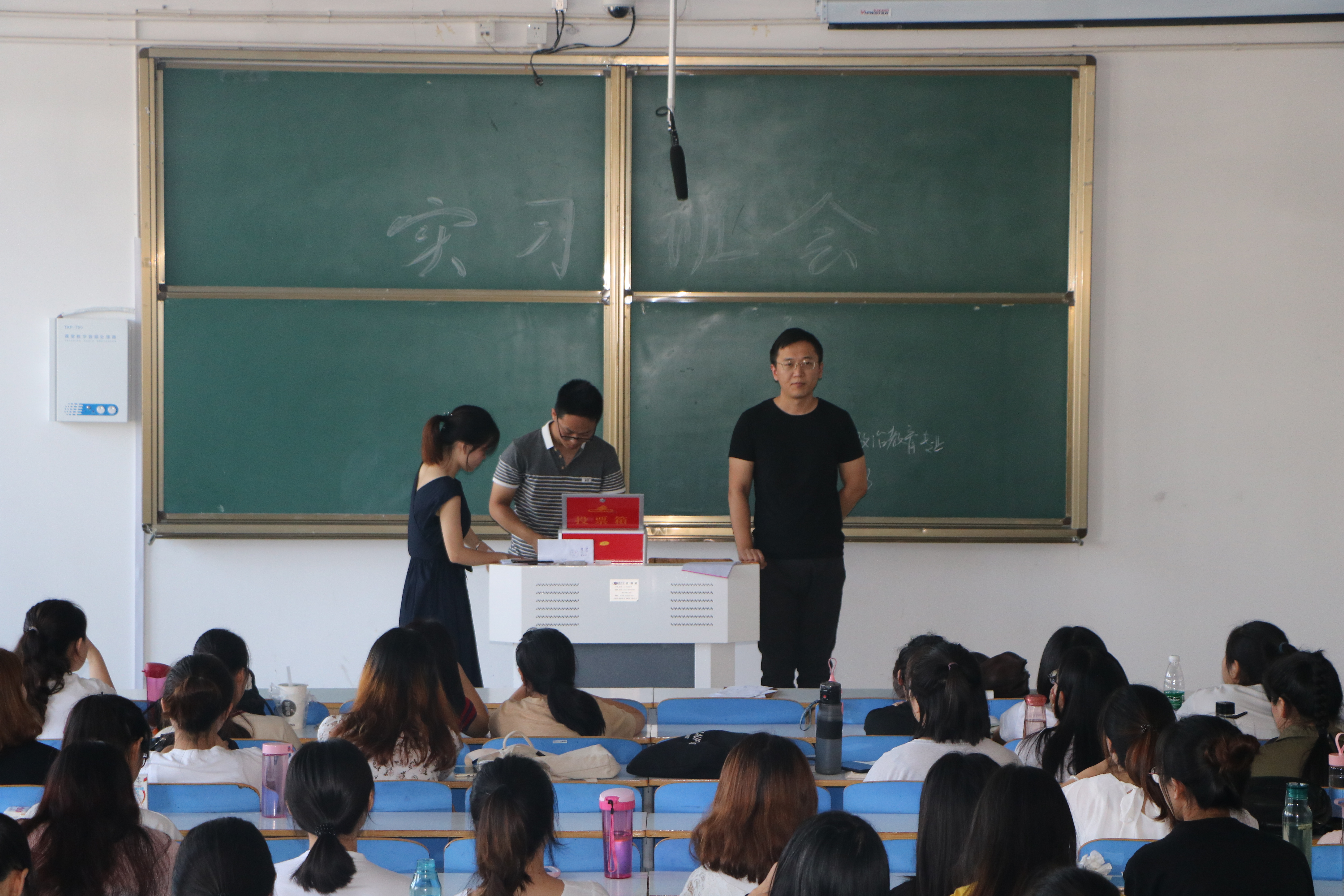 会上,曹栋介绍了本次教育实习的基本情况,着重说明了大学生实习的必要性,并鼓励大家踊跃参与实习活动,提高自己教育实践能力。随后,在曹栋的带领下,与会学生秉承公平、公开、公正的原则,以自愿报名和抽签相结合的方式,确定了顶岗实习、学校集中安排实习和自主实习的学生名单。最后,曹栋对实习学生提出要求希望实习学生能端正实习态度,注意实习期间安全,切实做好实习准备工作。