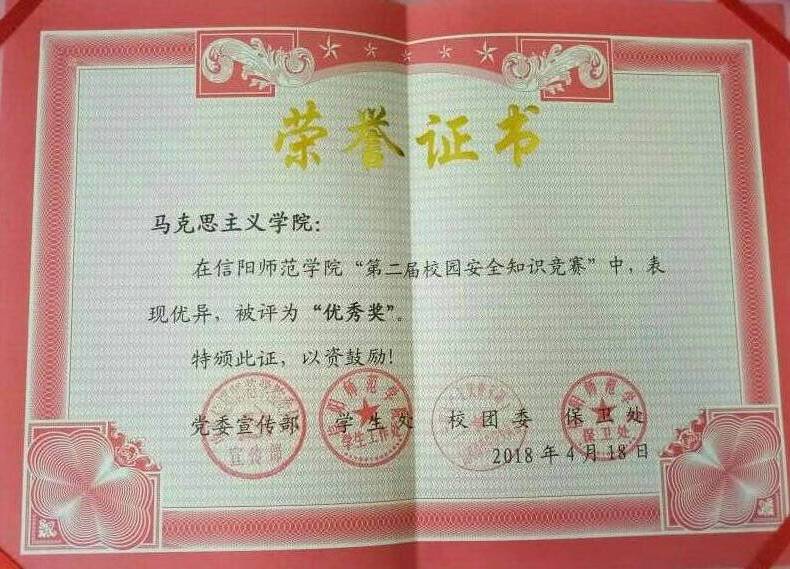 由金年会官网王冰、刘雅丹、李明靓、黄锦四名同学组成的代表队,在信阳师范学院“第二届校园安全知识竞赛”中,表现优异,荣获“优秀奖”。