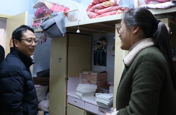 唐国战一行先后走访了金年会官网学生所在的1号、4号宿舍楼。在走访过程中,唐国战亲自核实宿舍人员到校情况,并与学生展开亲切的交流。他对同学们的寒假生活状况以及寒假调研内容进行了仔细询问,并叮嘱大家注意天气变化、用电安全,为新学期上课做好准备。领导老师们悉心询问了同学们在学习、生活方面的困惑,同时也给出自己的建议。同学们听后纷纷表示获益匪浅,收获良多。
