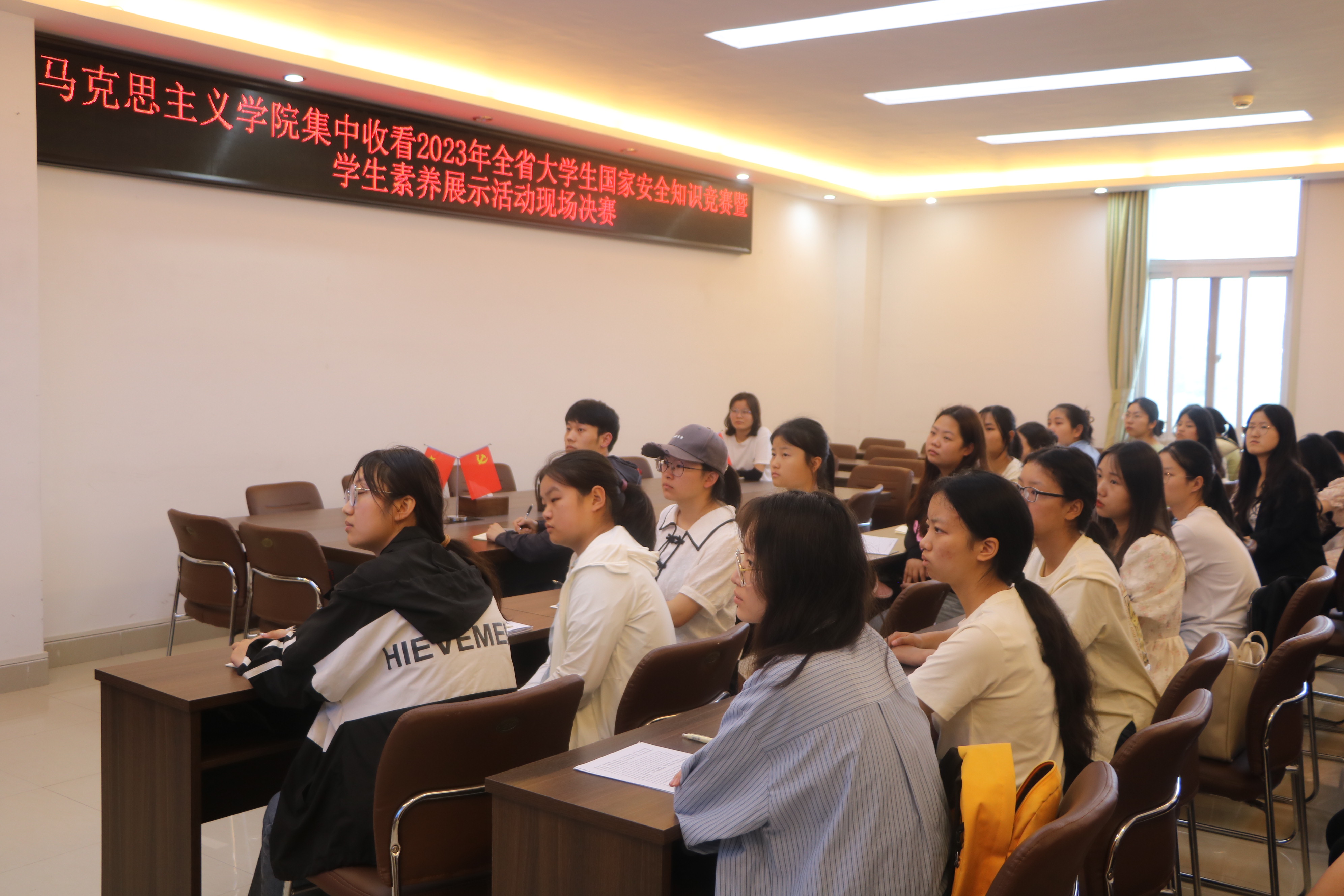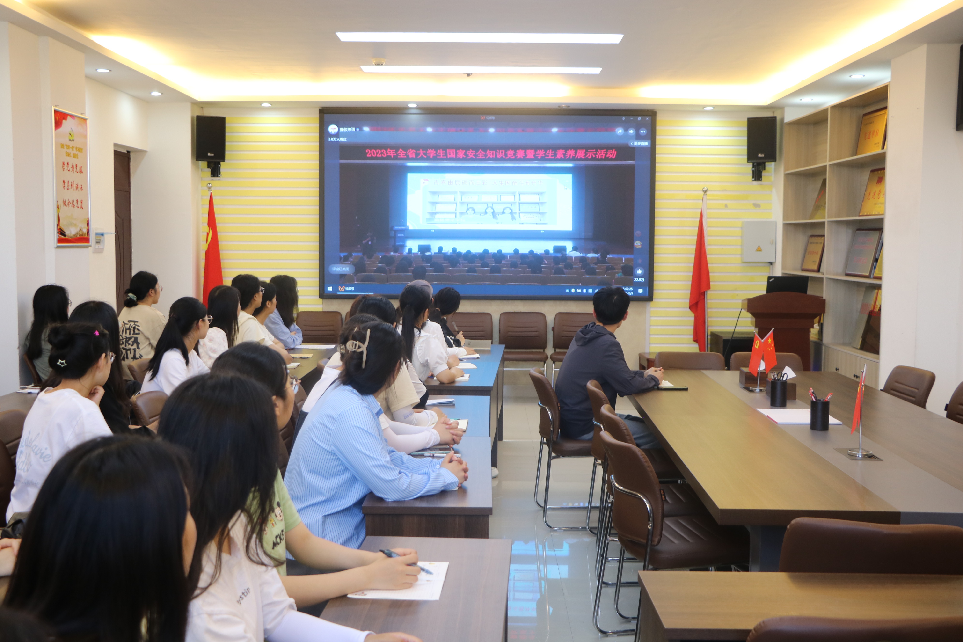 6月9日下午,金年会jinnianhuicom在社科楼323会议室组织线上观看“2023 年全省大学生国家安全知识竞赛暨学生素养展示活动现场决赛”。金年会官网专职辅导员沈海蓄、学生会执行主席闫梦辉以及部分学生代表共同观看。