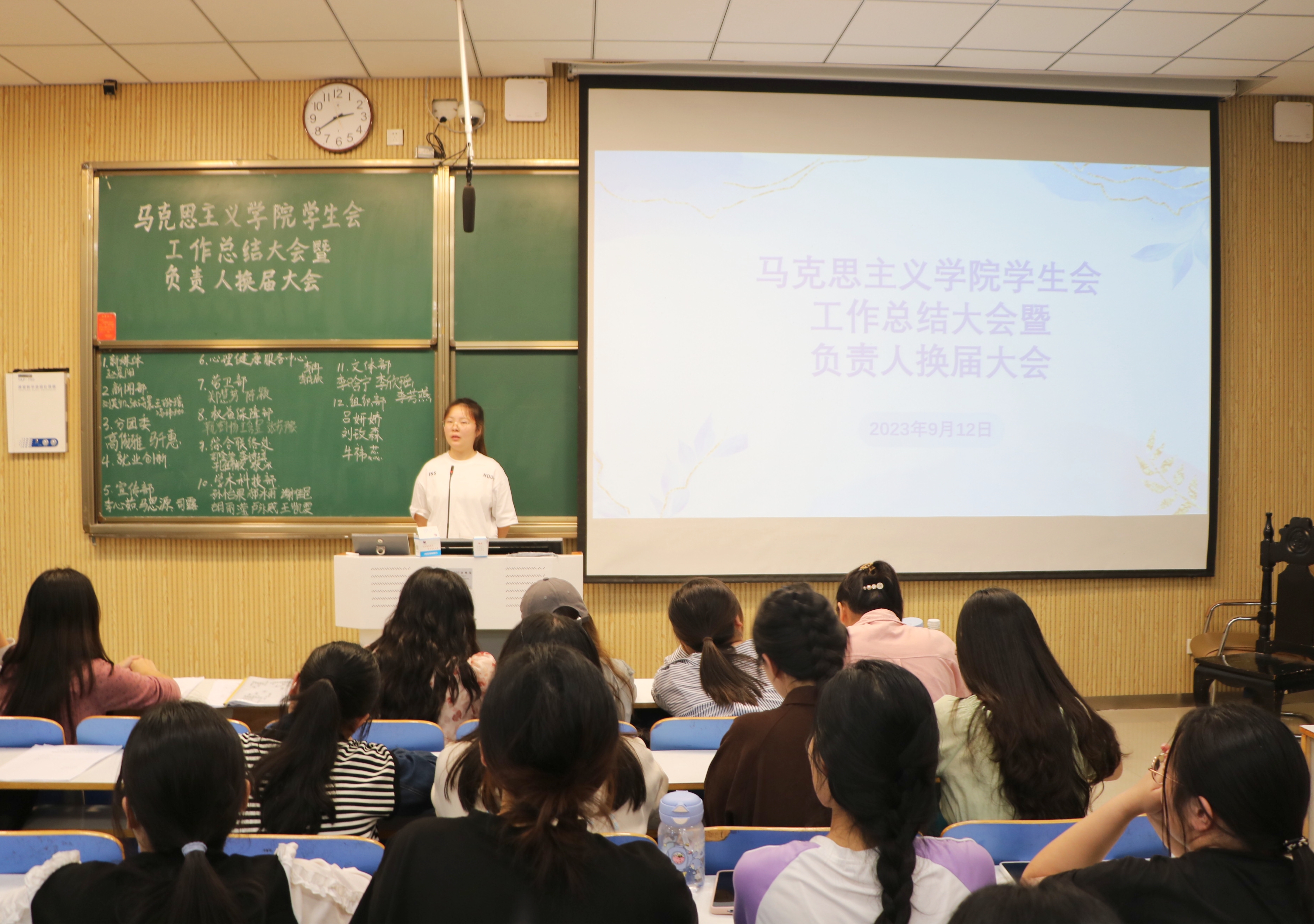 为确保竞选程序公平公正,各部门负责人抽签决定竞选顺序,并在黑板上公布候选人名单。接着,各部门候选人依次上台,从自身工作经历、竞争优势、未来展望等方面进行竞选发言。主席团成员以及各部门负责人围绕个人优势、工作规划、突发情况处理等方面对竞选人进行提问。各位竞选人面对提问思路清晰,对答如流,展现出朝气蓬勃的精神面貌,彰显了恪尽职守的责任担当。最后,闫梦辉对本次大会做出总结,希望各位学生干部能够持续提升学生会活力,切实履行自己的职责,增强自身责任感和使命感,积极主动开展各项工作,共同打造一个充满活力的优秀学生组织。