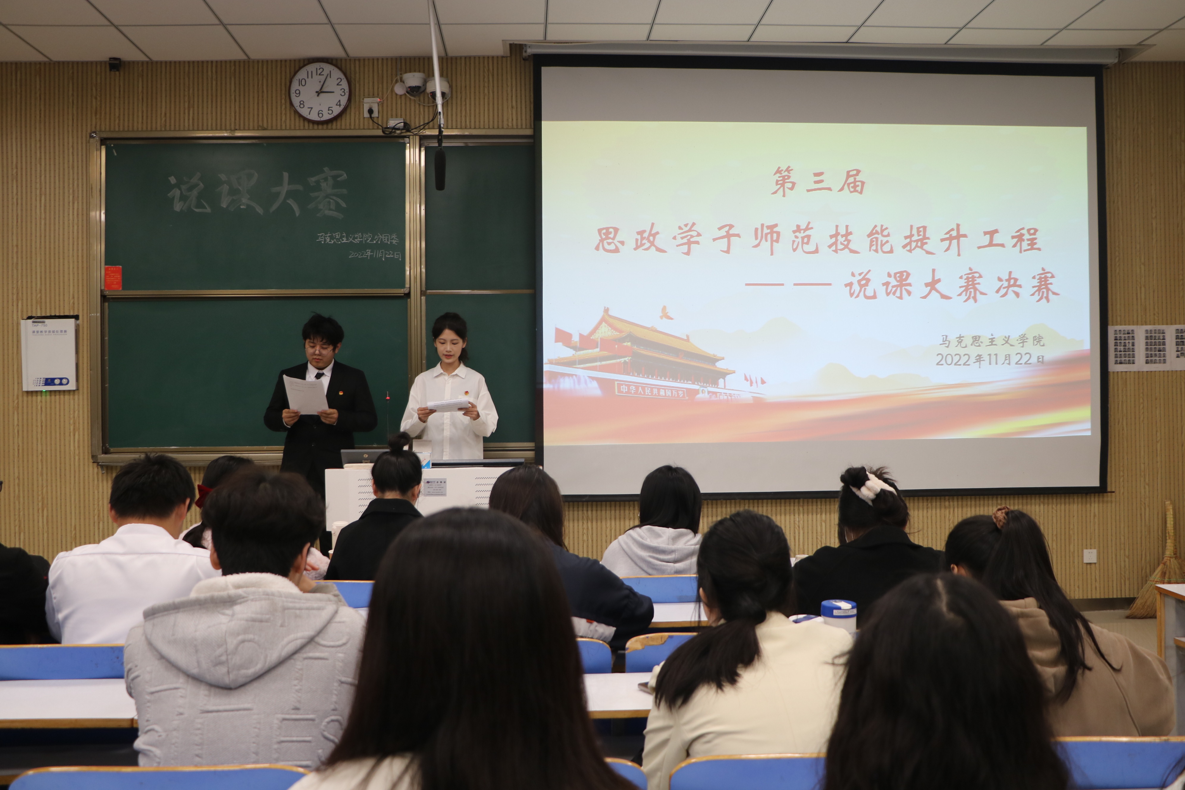 为增强师范生课堂创新能力,强化基本功训练,展示师范生课堂教学风采,11月22日下午,由金年会jinnianhuicom分团委学生会学术科技部、南湖理论研讨社共同组织的说课大赛决赛在社科楼515教室举办。金年会官网专职组织员任婷、团委老师高小佳和学生会主席团成员共同担任此次比赛的评委。比赛由朱新语、孔德雨主持。