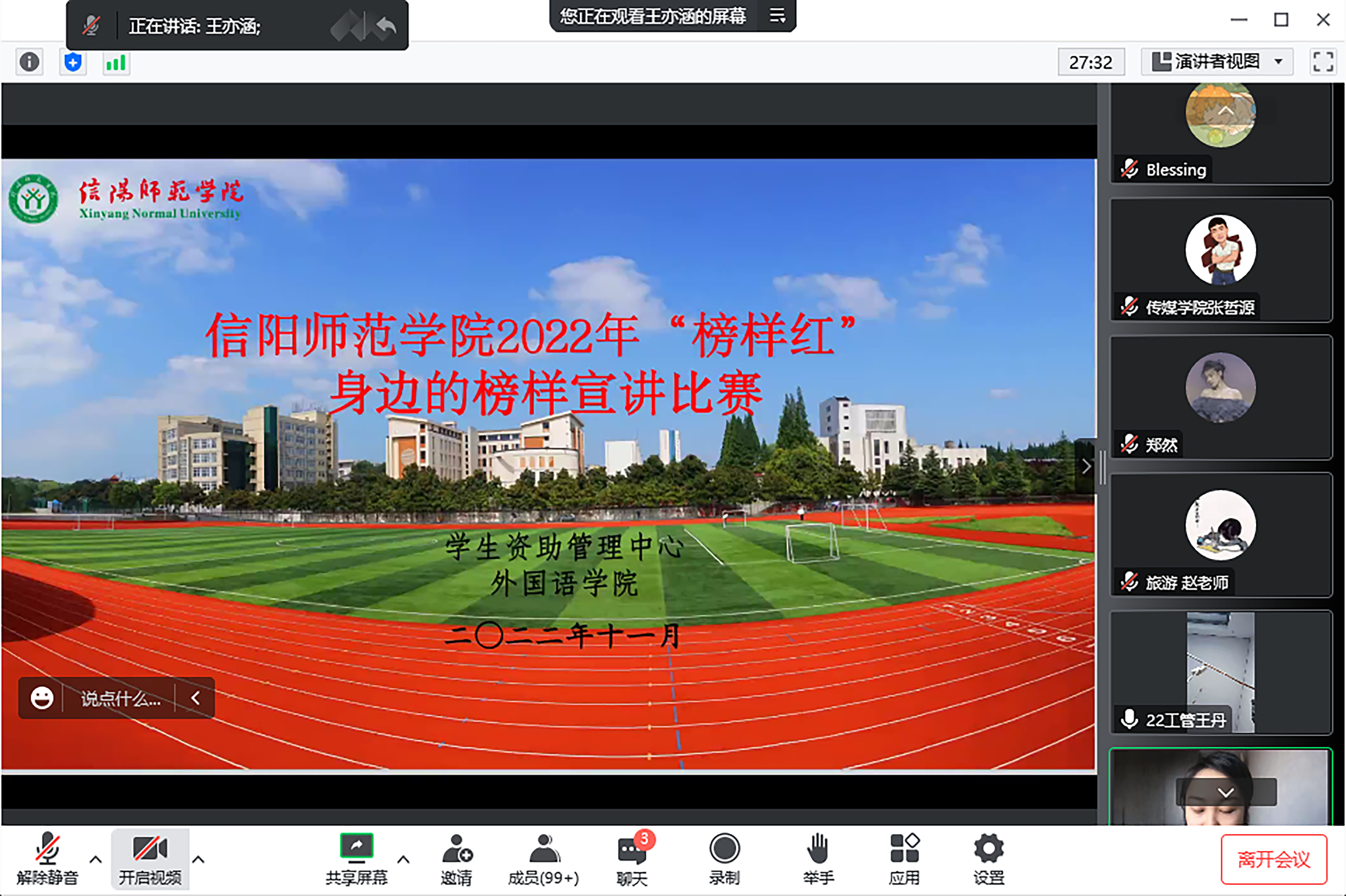 11月30日下午,金年会jinnianhuicom在腾讯会议上开展“身边的榜样”宣讲活动。宣讲人传媒学院校园明星张哲源、音乐与舞蹈学院自强之星李佳潞、外国语学院国家奖学金获得者王亦涵和金年会官网2021级、2022级全体学生共同参加此次宣讲活动。活动由旅游学院团委书记赵子鉴主持。
