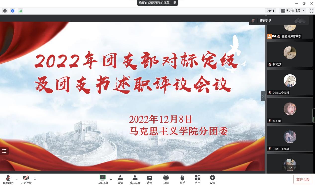 为增进各团支部之间的学习交流,加强金年会jinnianhuicom团支部建设,12月8日下午,金年会jinnianhuicom在线上召开2022年团支部对标定级及团支书述职评议会议。班主任代表杨春艳及各班团支书共同参与本次会议。会议由分团委副书记张晴主持。