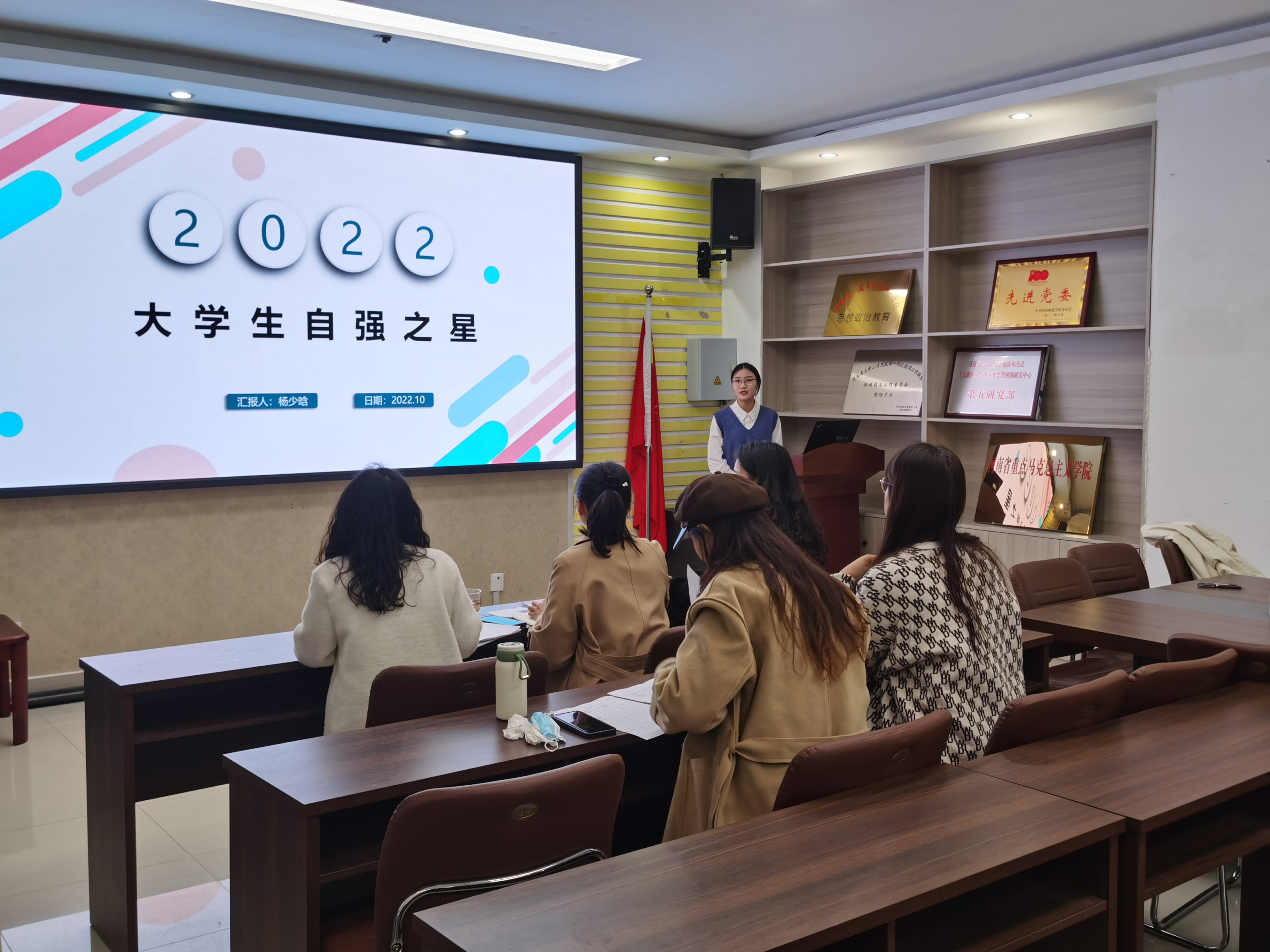 为深入贯彻落实习近平总书记关于青年工作的重要思想,鼓励青年践行“强国有我”的青春宣言,10月26日上午,金年会jinnianhuicom在社科楼323会议室举办了“大学生自强之星”候选人评选活动,金年会官网团委书记陶青青,专职组织员任婷,班主任王明园、杨春艳、吴梦云出席活动并担任评委。活动由组织部负责人韩奕晨主持。