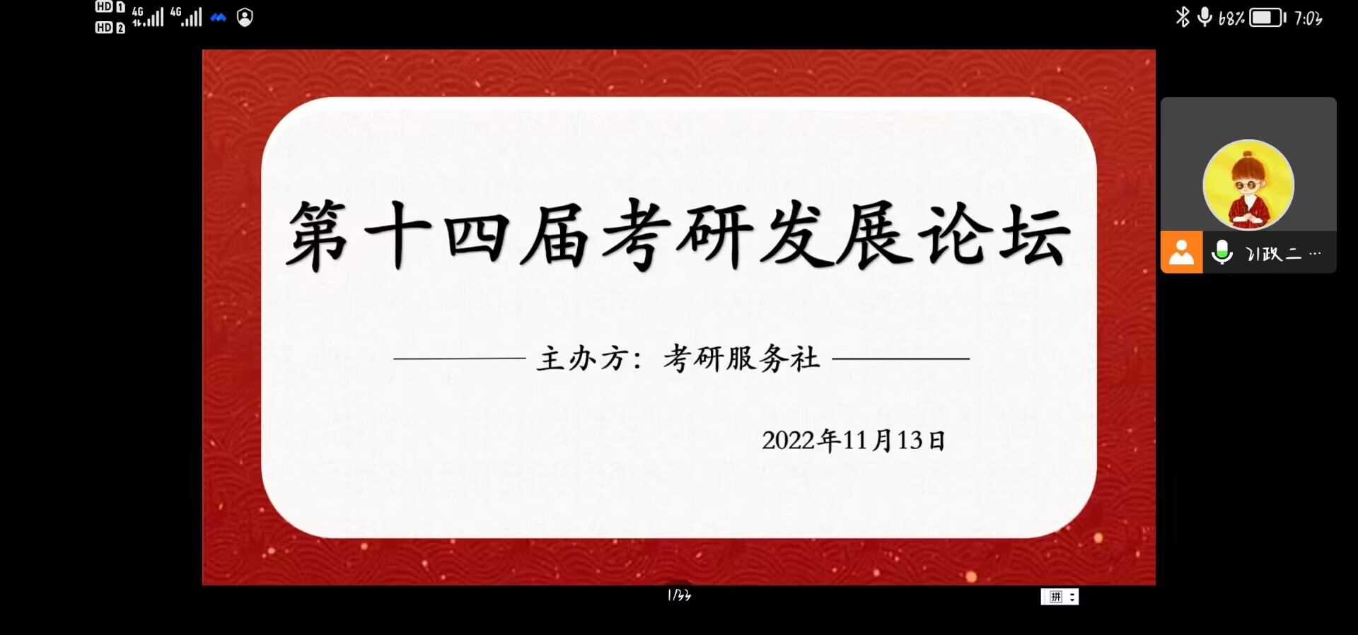 功不唐捐,玉汝于成。11月13日晚上,由金年会jinnianhuicom考研服务社组织的第十四届考研发展论坛在线上顺利举行。聚星文登考研指导老师吕明明、校学生会社团部及百名学子共同参加本次论坛。活动由朱钰阁、李雪静主持。