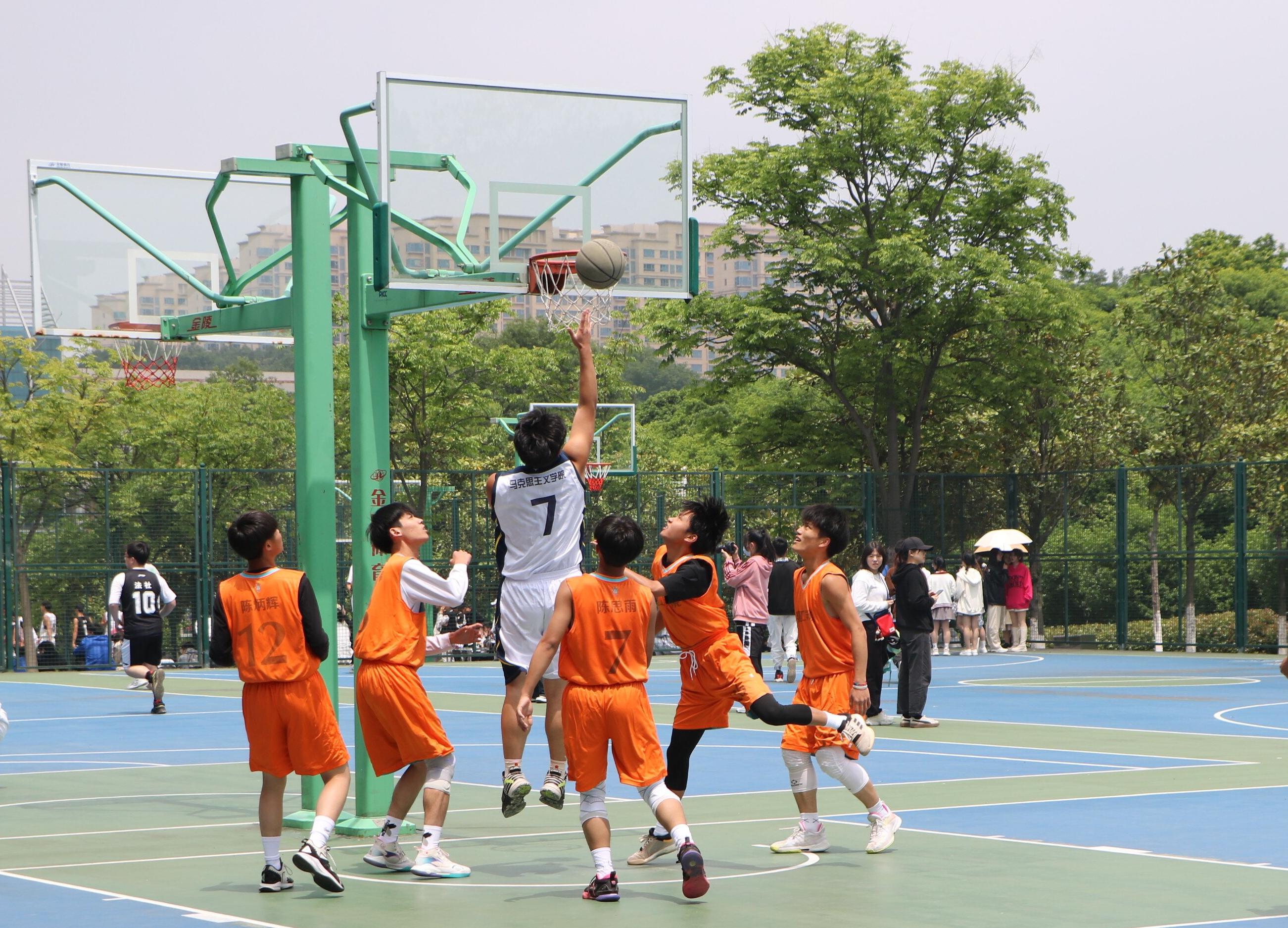 4月29日中午,金年会jinnianhuicom男子篮球队与建筑与土木工程学院男子篮球队在西篮球场进行第二十届“谭山杯”男篮小组赛第四场。两院学子共同观看此次比赛。