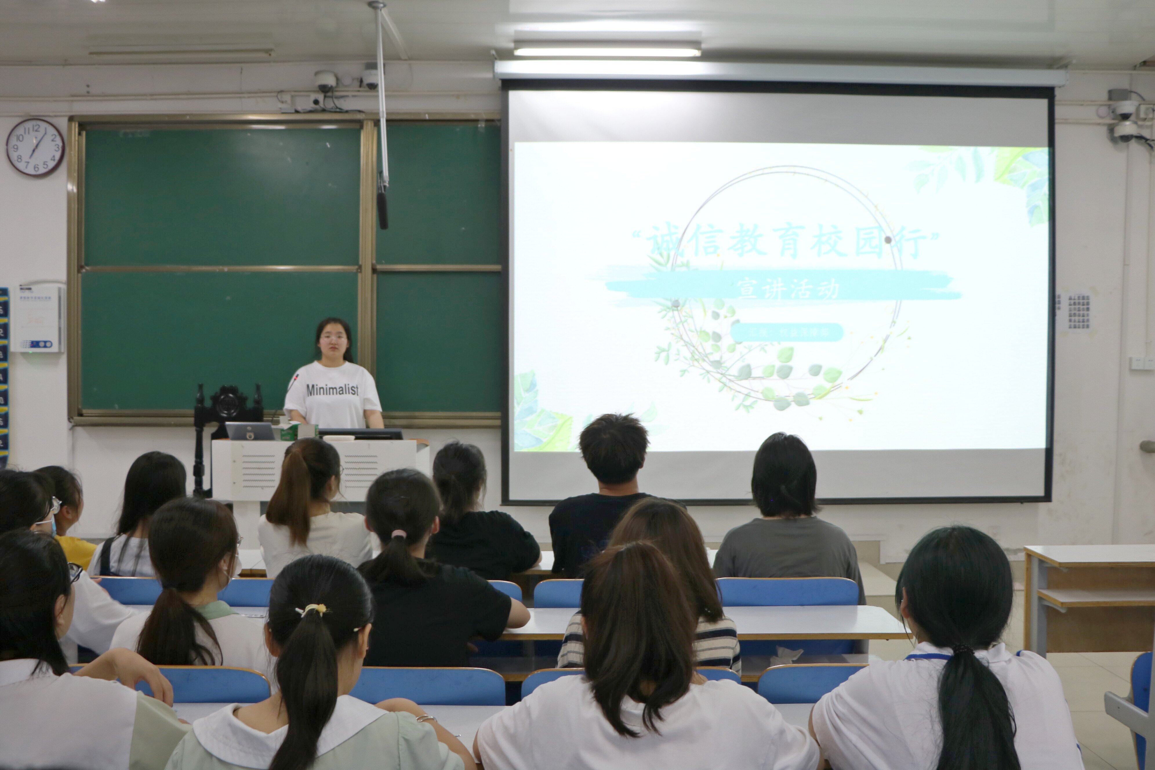 5月25日晚,金年会jinnianhuicom在社科楼516教室开展“诚信教育校园行”宣讲活动。2021级全体同学参加此次宣讲活动。活动由权益保障部负责人宋佳怡主持。