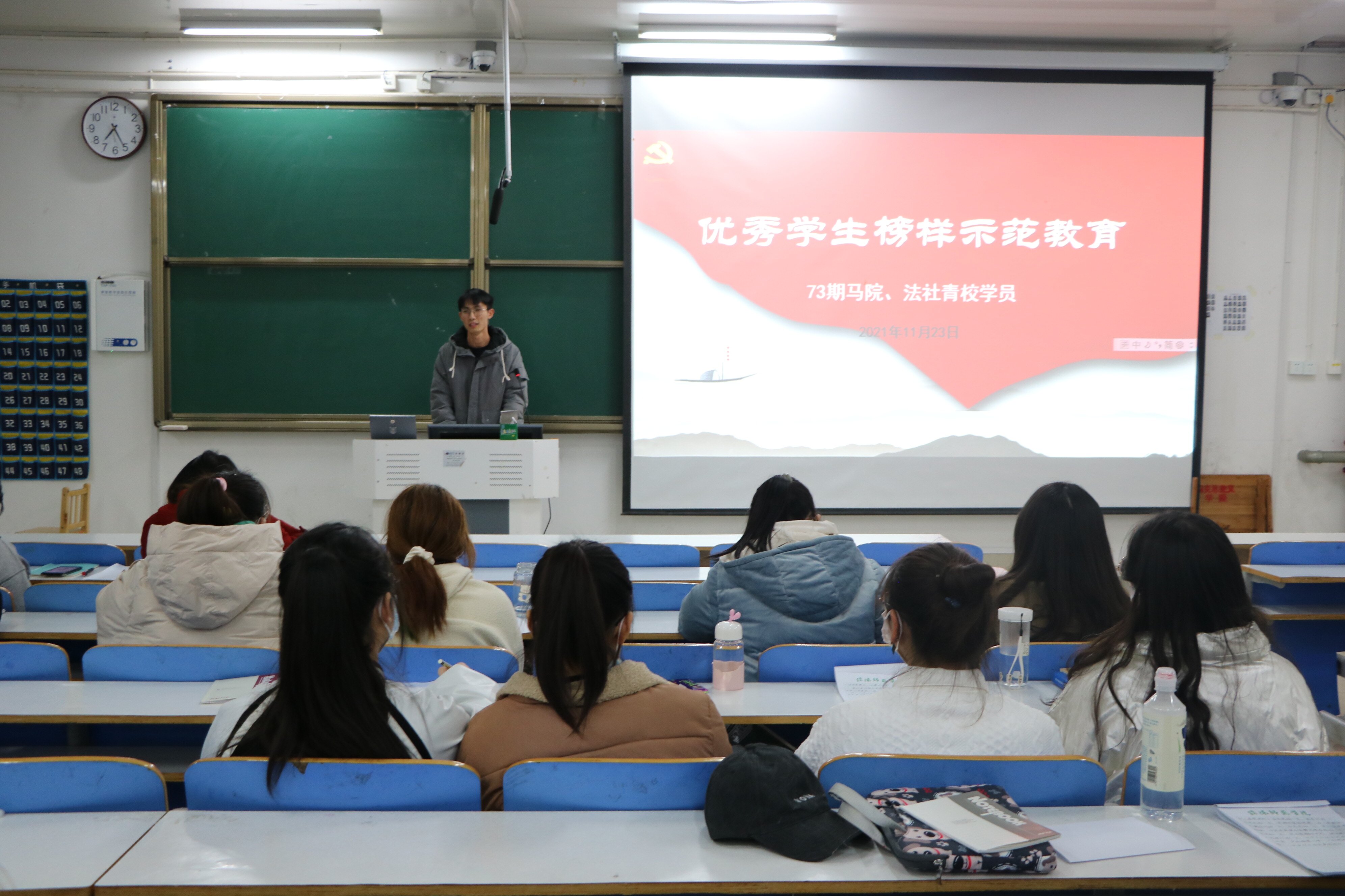 11月23日晚,金年会jinnianhuicom和法学与社会学学院第73期青校学员在社科楼516教室开展优秀学生榜样师范教育活动。活动由法学与社会学学院组长张璨主持。