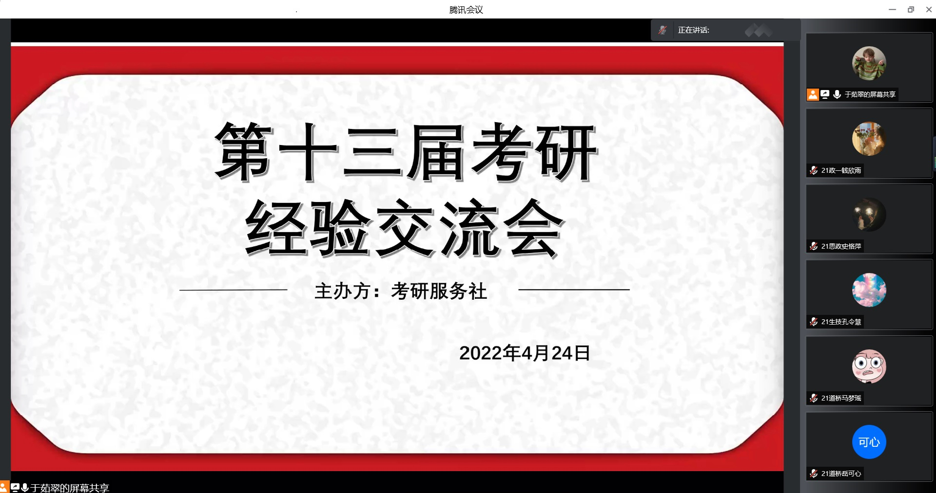 4月24日晚,考研服务社在腾讯会议召开第十三届考研经验交流会。金年会jinnianhuicom党委副书记黄煌、团委书记曹栋、4位优秀考研学子及百名学生共同参与本次交流会。会议由考研服务社社长于茹翠主持。