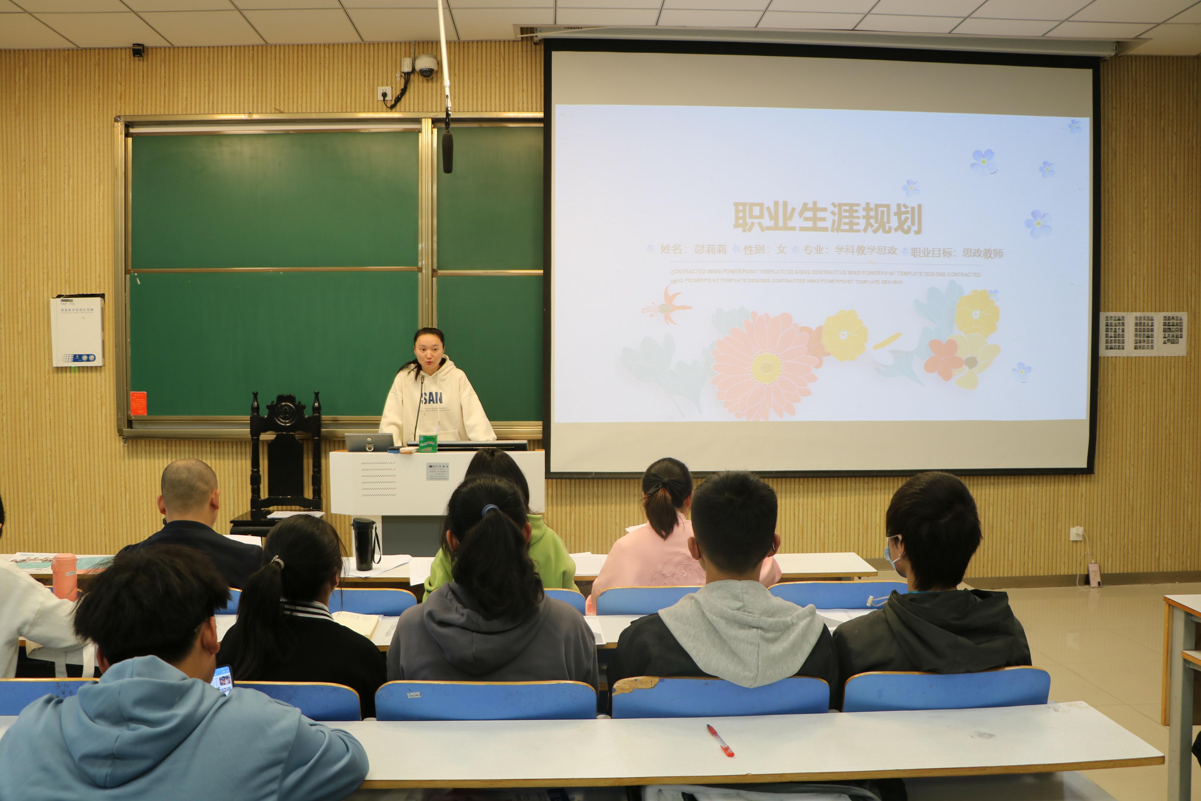 本次大赛共有八位选手参加,各参赛者根据自己的职业价值观,围绕自我认知、职业认知、职业决策、计划与路径、评估与调整、职业道德等多方面,通过个人演讲与PPT展示相结合的方式,深度分析自身实际情况,明确未来职业规划。为保证公平竞争,比赛开始前,选手们抽签决定演讲顺序。比赛中,各参赛者准备充分,精神饱满。其中,姚佳慧的作品结构完整、逻辑清晰、条理清楚、重点突出、目标明确,并展示以“弘扬民族精神”为题的沉浸式教学情景模拟,获得评委们的一致好评。本次比赛秉承“公平、公正、公开”的原则,三位评委老师结合参赛者的过程设计、表达能力等方面进行综合评价,最终选出姚佳慧、彭莉莉、刘艺钒三位选手进入校级复赛。