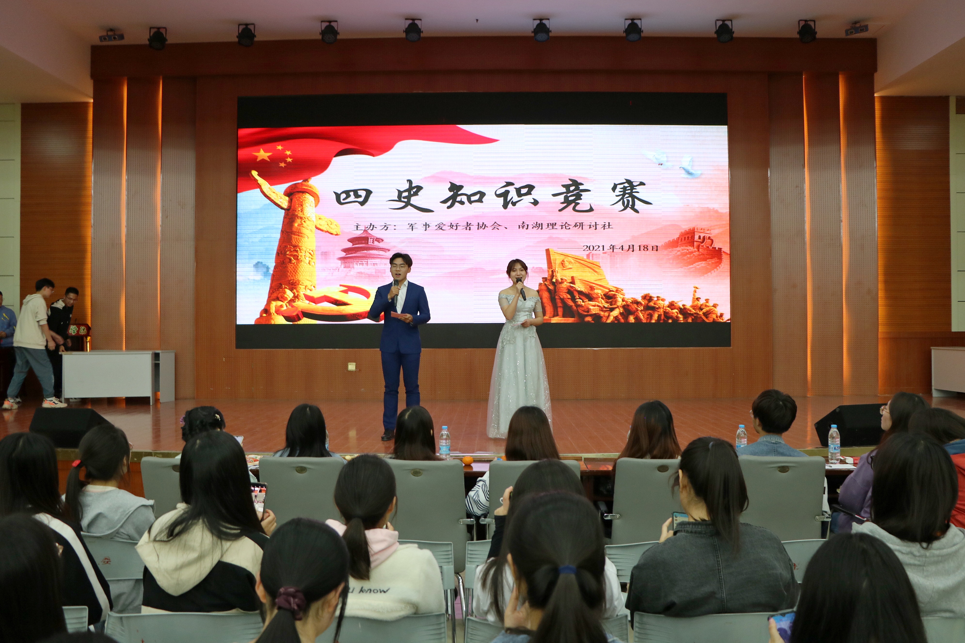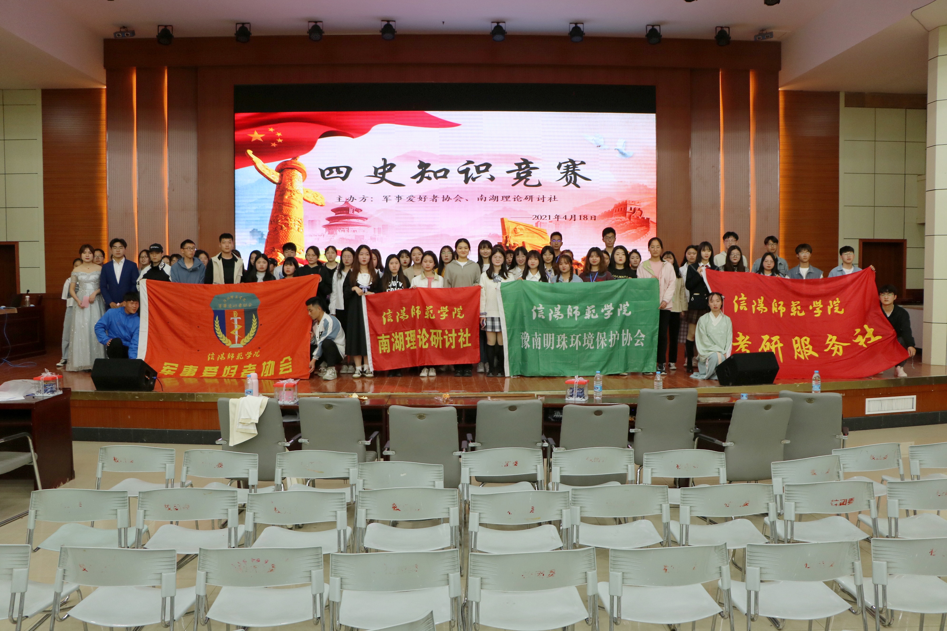莘莘学子学四史,同心向党迎华诞。为激励广大学子铭记光辉历史,将红色基因内化于心,外化于行,4月18日晚,由金年会jinnianhuicom南湖理论研讨社、考研服务社、豫南明珠环境保护协会与军事爱好者协会共同举办的“四史”知识竞赛决赛在逸夫楼报告厅顺利进行。金年会jinnianhuicom团委主席团成员、各社团负责人担任此次比赛的评委。比赛由刘金铭、邵子原主持。
