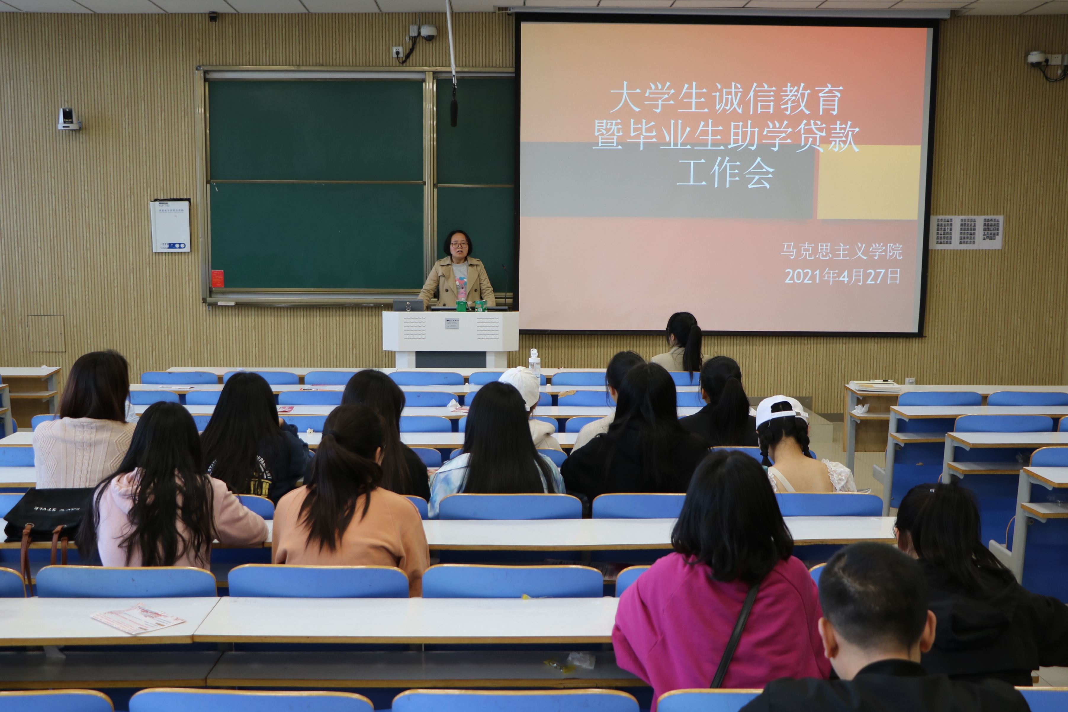 为认真做好我校2021年度贷款毕业生毕业确认工作、信息采集工作,确保我校国家助学贷款工作顺利开展,4月27日下午,金年会jinnianhuicom在社科楼515教室顺利召开大学生诚信教育暨毕业生助学贷款工作会。金年会jinnianhuicom团委老师曹菁菁,权益保障部负责人祝润豪、何仪以及2017级学生共同参加了本次会议。会议由曹菁菁主持。