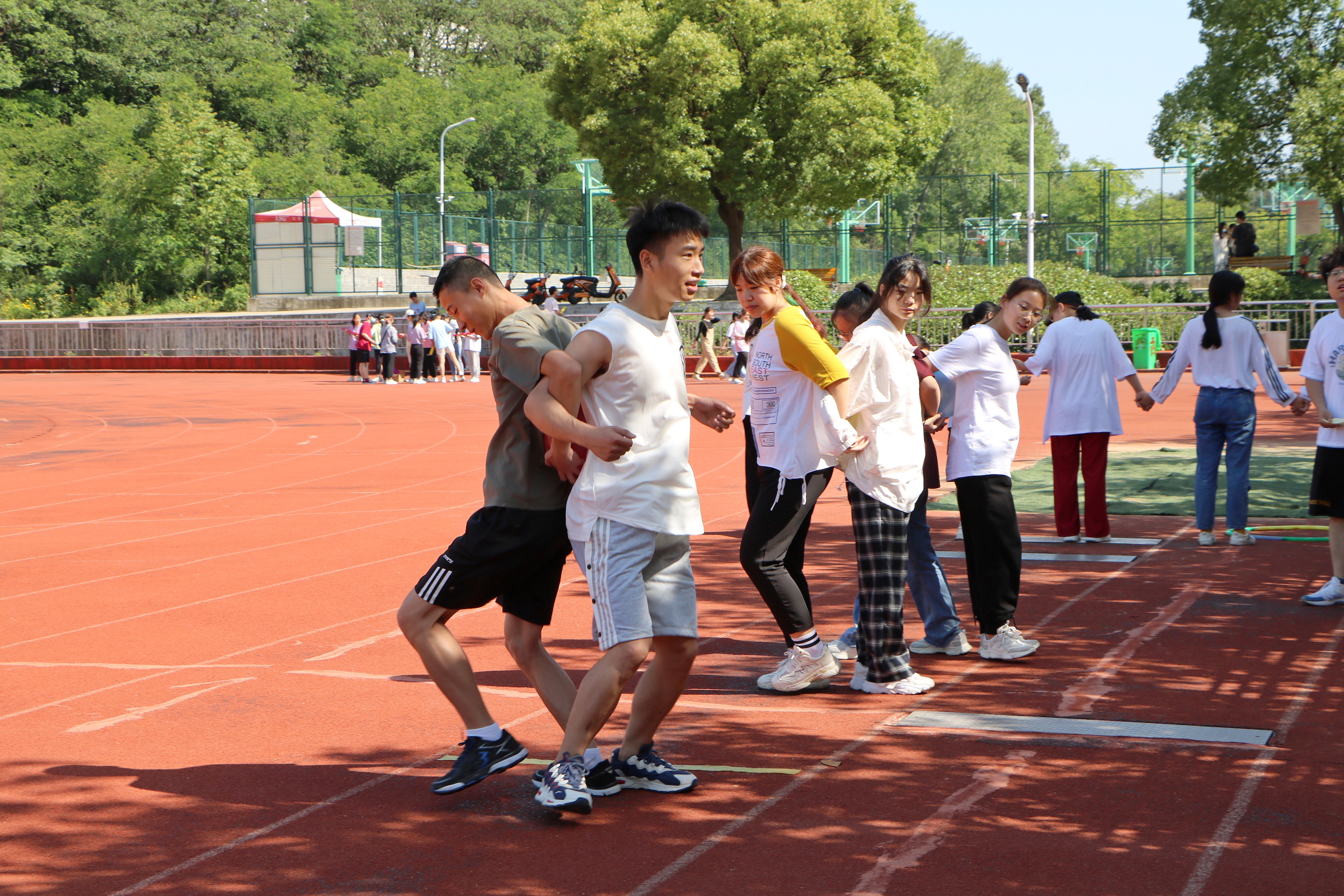 本次趣味运动会以放松身心、愉悦生活为主旨,采取小组比赛的形式进行。活动开始前,负责人卢珊珊组织同学们自由组队,并向他们简要介绍了游戏规则。在组织人员的带领下,同学们积极有序地参加了“合作传球”、“看你行不行”、“背对背传递”、“一圈到底”和“合作弹球”五个集体游戏项目。其中,“背对背传递”游戏在增强同学们团队意识的同时还展示出新时代大学生的蓬勃朝气和竞技热情。游戏期间,同学们按照游戏要求,积极讨论,相互配合,在游戏过程中体验到团结的重要性,提高了团队合作能力,加强了彼此之间的沟通交流,在欢声笑语中放松了身心,释放了压力。游戏结束后,工作人员记录小组的积分情况,并为前三组同学发放奖品,后三组同学则进行了节目表演。