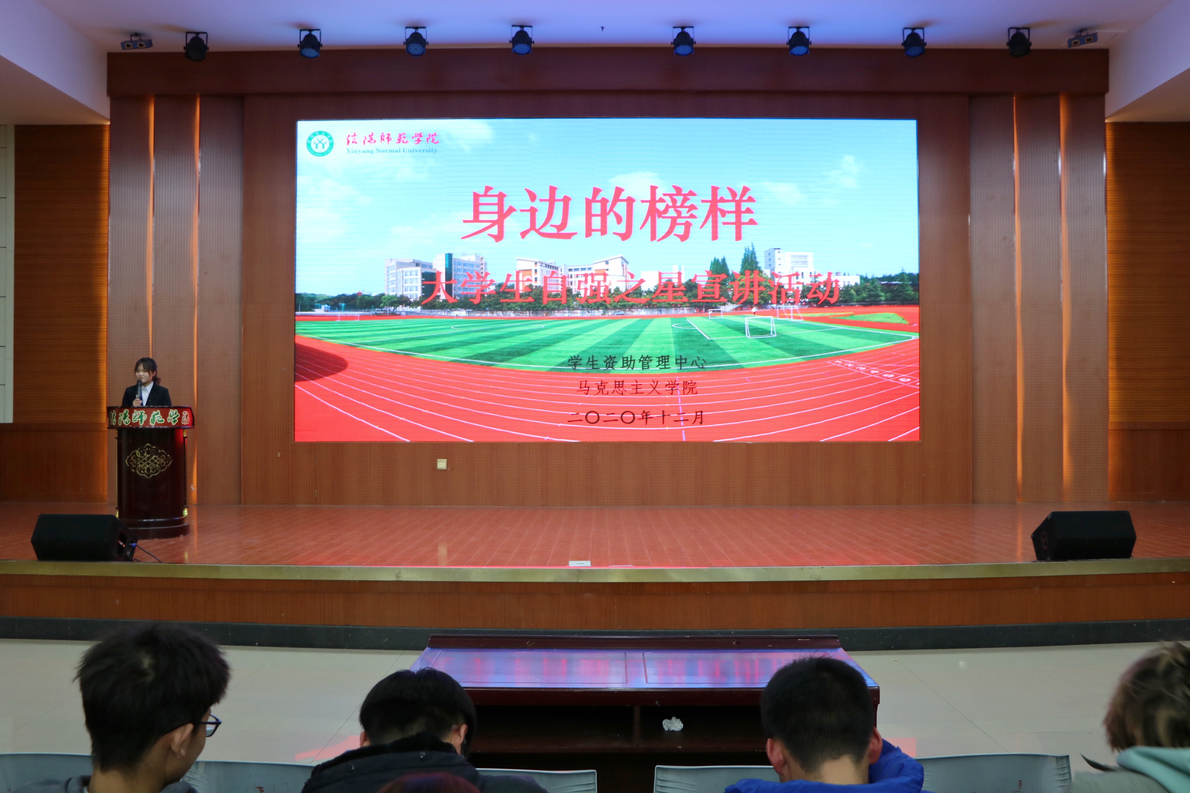 为大力推进大学生思想教育工作,彰显榜样力量,激励金年会官网学子艰苦奋斗、顽强拼搏,12月16日晚,由金年会jinnianhuicom主办的“身边的榜样”大学生宣讲活动在逸夫楼报告厅举办。金年会官网团委老师曹菁菁、数学与统计学院贾晴岚、体育学院王梦卓、音乐与舞蹈学院许美佳以及金年会官网2019级、2020级全体学生共同参加此次活动。活动由曹菁菁主持。