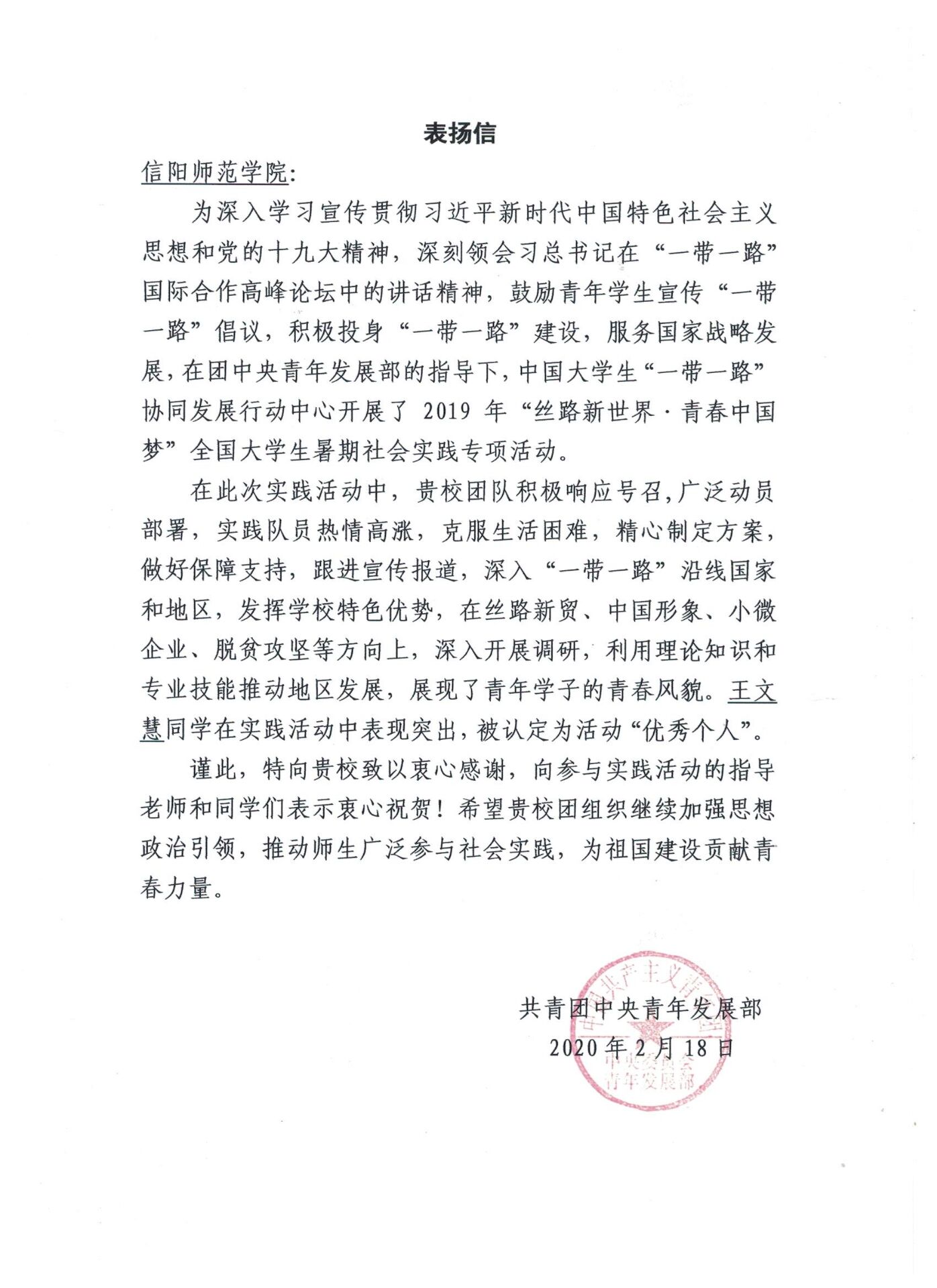 2020年9月21日,金年会jinnianhuicom收到由共青团中央青年发展部发来的表扬信,信中提及金年会官网积极响应共青团中央的号召,参与由中国大学生“一带一路”协同发展行动中心开展的2019年“丝路新世界·青春中国梦”全国大学生暑期社会实践专项活动,团队队员热情高涨,充分展现金年会jinnianhuicom学子的青春风貌。