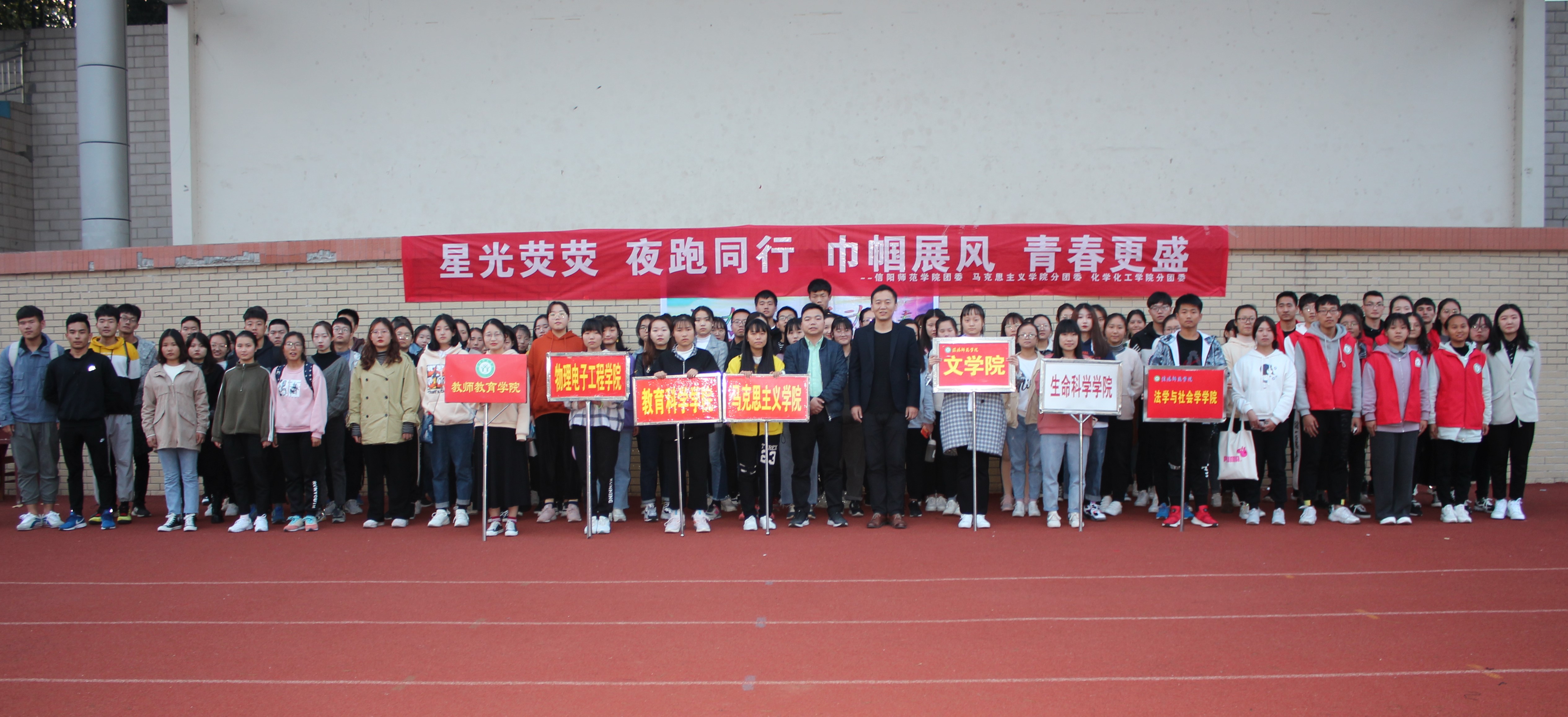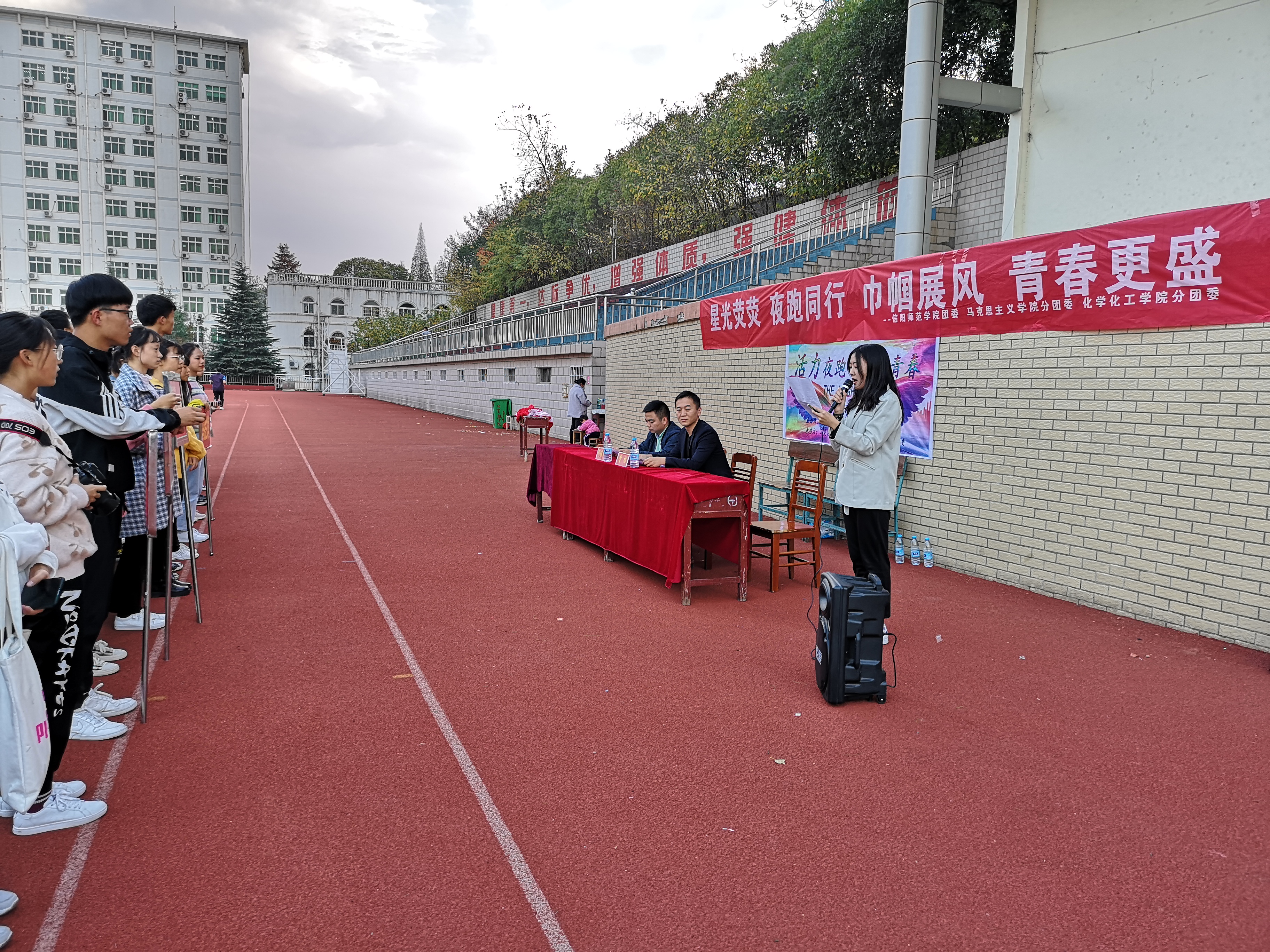 11月15日下午,由信阳师范学院校团委主办,金年会jinnianhuicom和化学化工学院联合承办的“活力夜跑,跃动青春”夜跑活动开幕式在西操成功举行。金年会官网团委书记曹栋,化学化工学院团委书记邓耀辉以及各院夜跑活动的参与者共同参加本次开幕式。开幕式由化学化工学院学生邵瑾主持。
