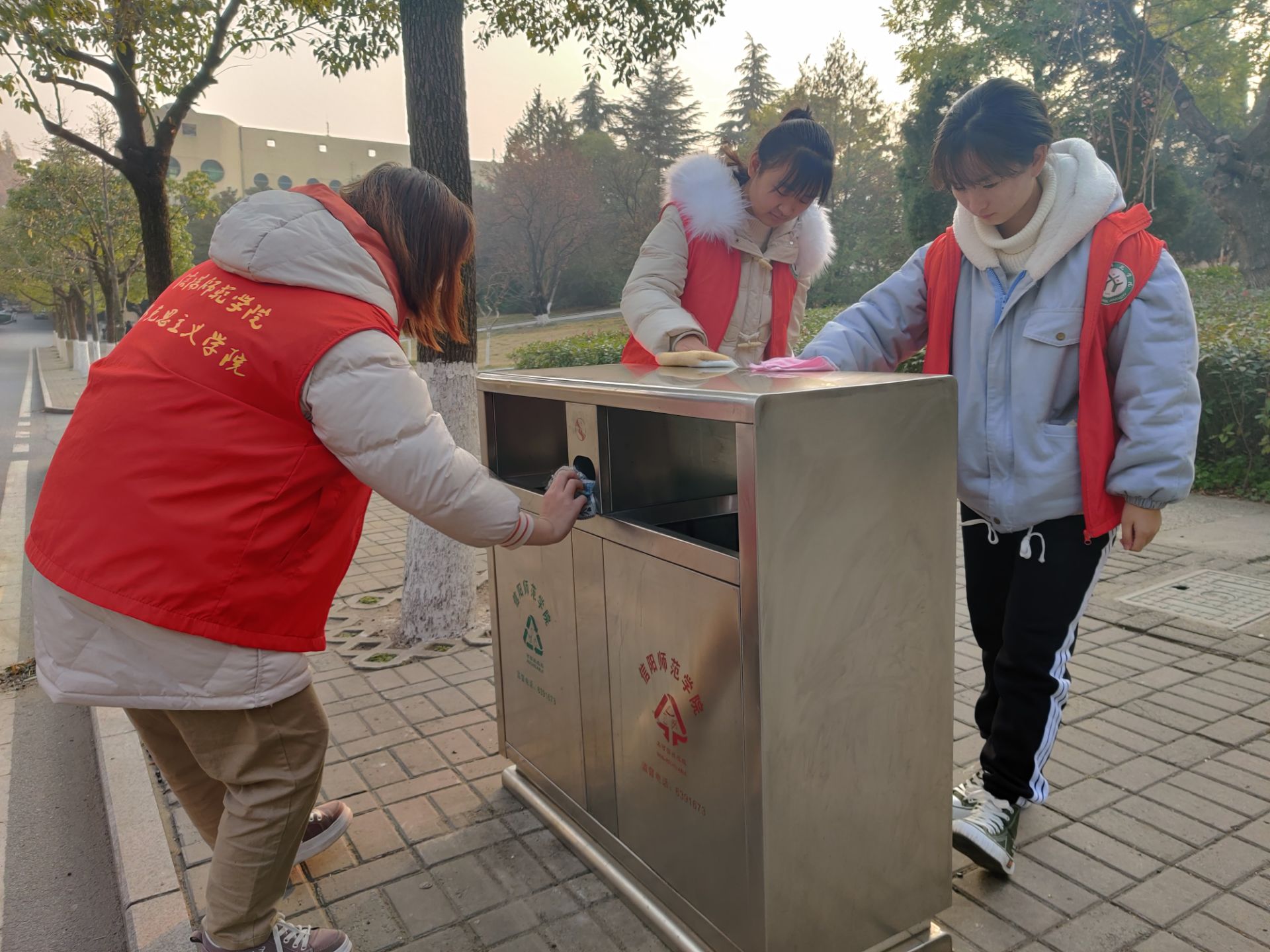 下午,金年会官网思想政治教育一班团支部书记贾子漪带领同学们在校园内进行垃圾桶清洁志愿服务活动。活动中,同学们擦除筒壁上的污渍,捡拾散落的垃圾并进行分类后放入桶内。明确的分工和默契的配合将校园垃圾桶清理得焕然一新。最后,同学们在一棵树广场发表了自己参与志愿服务后的心得体会,大家纷纷表示,日后的学习生活中要积极踊跃参加志愿活动,提高自身服务社会意识,争做优秀的青年团员。