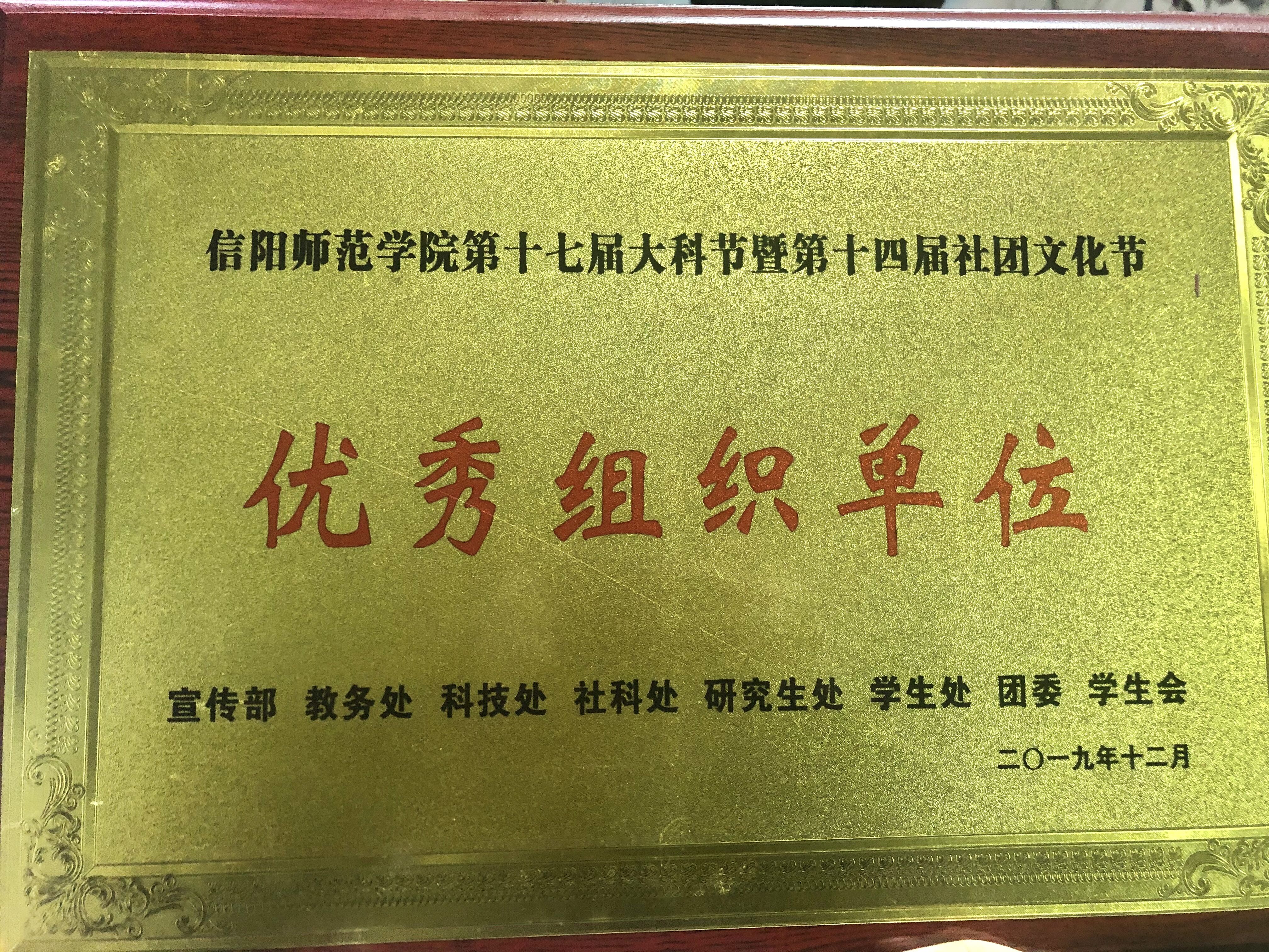 12月30日,信阳师范学院在理科楼报告厅举办“第十七届大学生科技文化艺术节暨第十四届社团文化节颁奖典礼”活动,经学校相关单位评定,金年会jinnianhuicom获得信阳师范学院第十七届大科节暨第十四届社团文化节优秀组织单位奖,金年会jinnianhuicom学子易思铭、王文芳和姜雨杭分别荣获第十四届大学生“自强之星”、第十四届“明星社长”称号和第十七届大学生科技文化艺术节“丹青墨韵”书画摄影比赛一等奖。