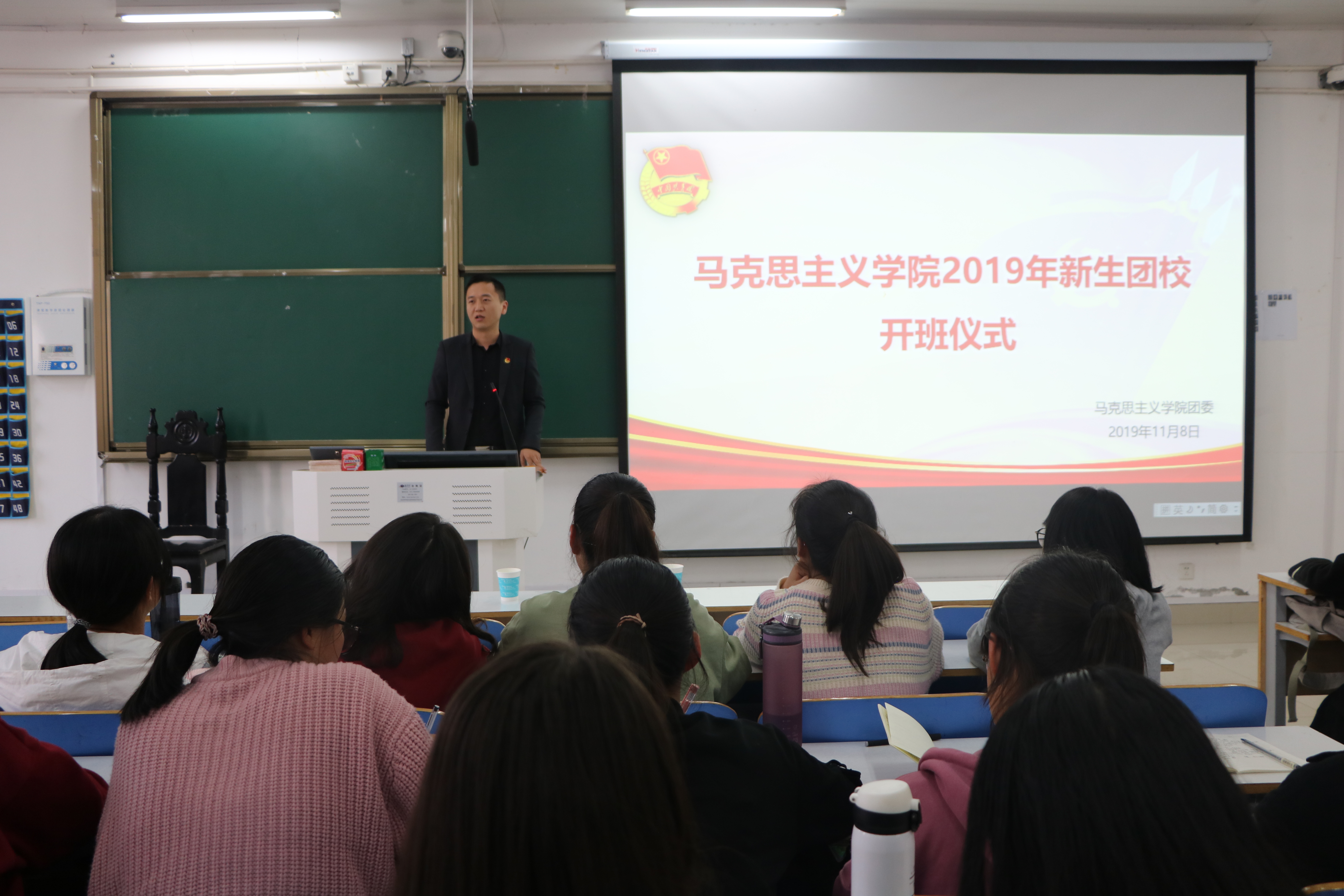 11月8日下午,金年会jinnianhuicom在社科楼516教室举办2019级新生团校开班仪式。团委书记曹栋,团委老师陶青青,18级部分团员及19级全体新生共同参会。会议由2018级团员李静主持。