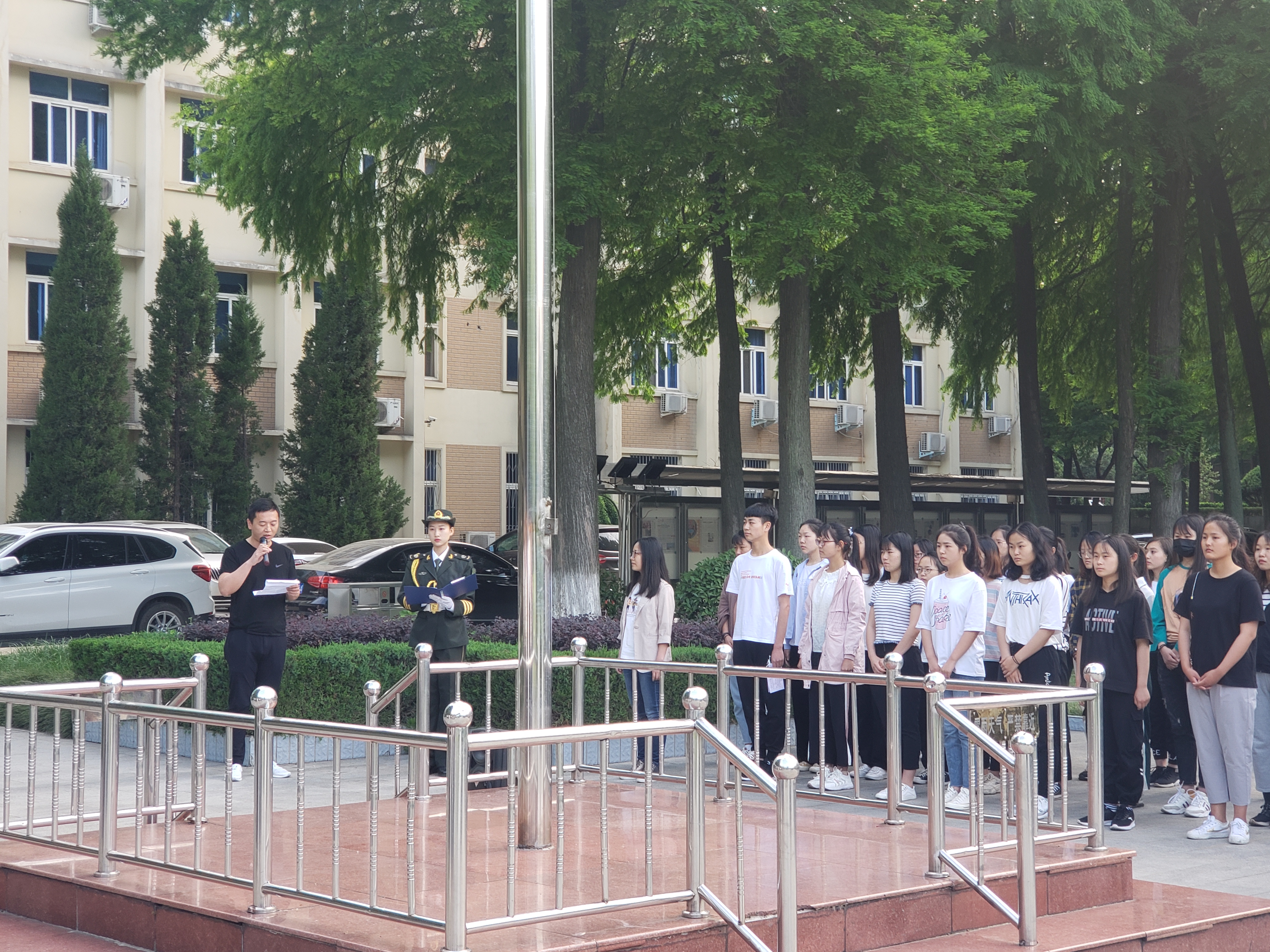 5月20日清晨,金年会jinnianhuicom于行政楼隆重举行升旗仪式。金年会官网团委书记曹栋,专职辅导员曹菁菁,我校国旗护卫队和2018级全体学生参加本次升旗仪式。仪式由国旗护卫队莫铭非主持。