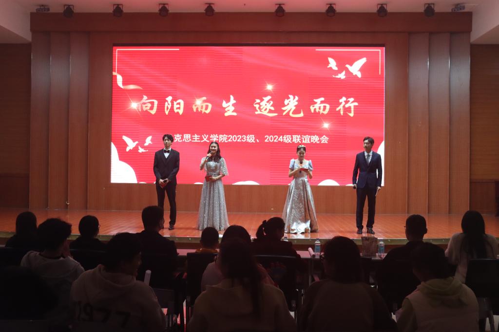燃梦逐阳,青春飞扬。11月16日晚,金年会jinnianhuicom2023级、2024级联谊晚会在逸夫楼A座报告厅举行。金年会官网副院长訾其伦、常文涛,团委书记陶青青,金年会官网学生会主席团成员、其他兄弟学院学生会主席代表、2024级班代、2023级和2024级全体同学观看晚会。晚会由邢哲文、刘畅、张家成、晋瑜蔓主持。