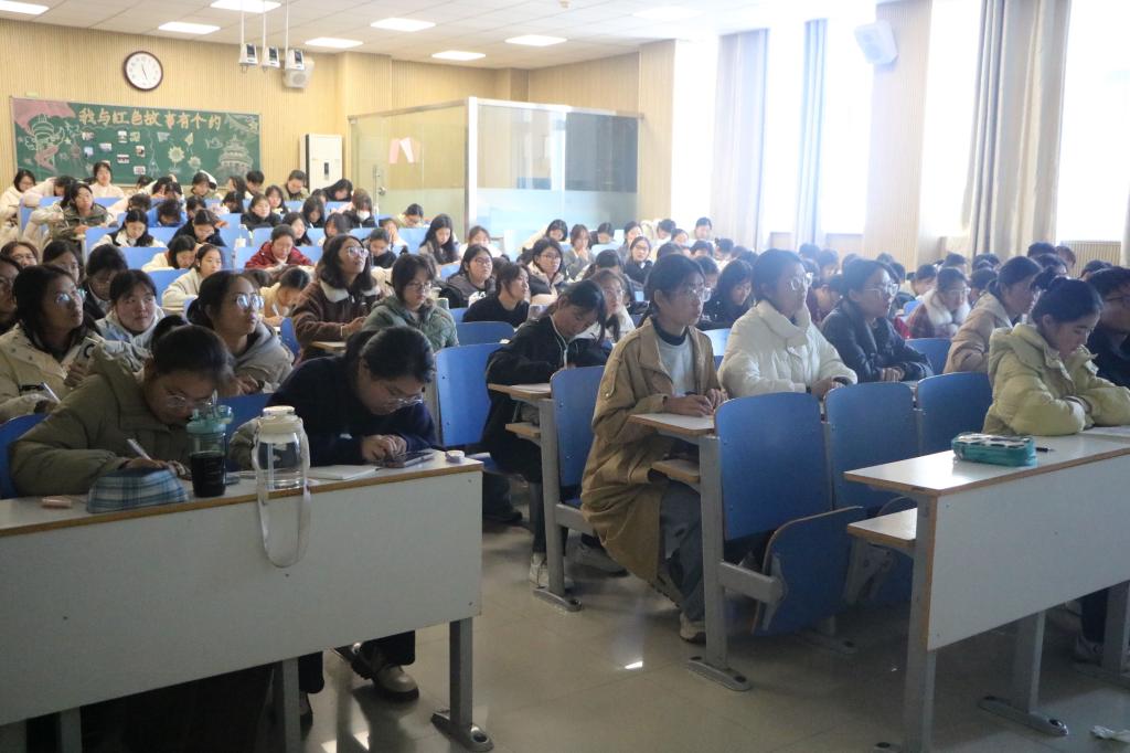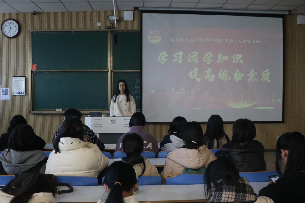 团课伊始,赵颖以中国共产主义青年团简介为切入点,对共青团的发展历程和基本职能做了初步的讲解。接着,她向同学们介绍共青团成立的历史,带领大家回顾共青团在革命、建设和改革时期的光辉历程,使同学们深刻理解共青团与共产党之间同呼吸、共命运的紧密联系。随后,她传授团学知识,深入讲解团章知识,进一步明确了团员的义务和责任,为新生们指明成长的方向。最后,赵颖组织大家交流讨论,并对此次团校活动进行总结。她指出,全体新生要自觉学习理论知识,深刻领悟团课内涵,不忘初心,牢记使命,坚定不移听党话、跟党走,怀抱梦想又脚踏实地,敢想敢为又善作善成,立志做有理想、敢担当、能吃苦、肯奋斗的新时代好青年,让青春在社会实践中绽放绚丽之花。