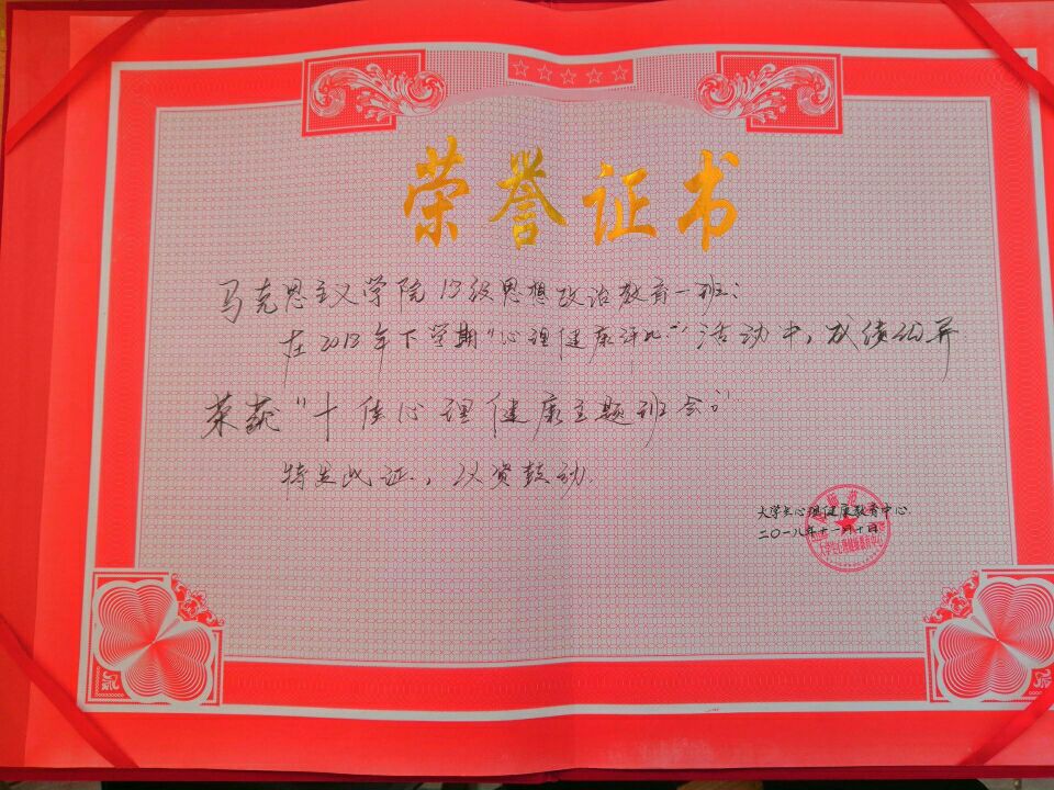 根据学校“心理健康教育主题班会”评比活动的相关要求,金年会官网代表班级2018级思想政治教育一班因心理健康教育班会内容充实、形式丰富,有一定实用价值,荣获“十佳心理健康教育主题班会”的称号。特对前一阶段金年会官网心理健康教育工作积极分子进行表彰。