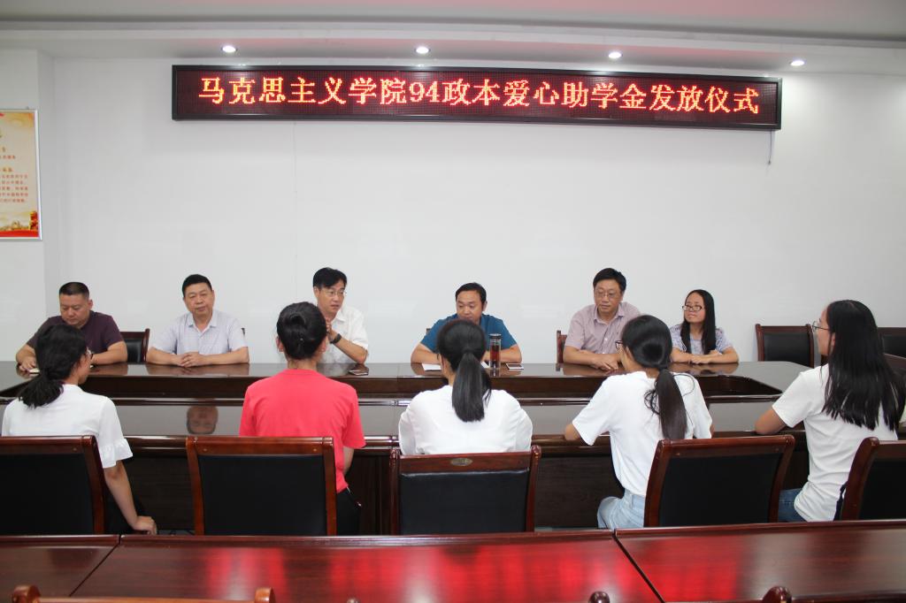 9月7日下午,金年会jinnianhuicom于社科楼323会议室举行94政本首批爱心助学金发放仪式。94政本校友代表中共信阳市委党校科研处副处长王瑞,学院副院长周智、程晋富,当代马克思主义研究所副所长门献敏,党委副书记何晓坚,团委老师曹菁菁及首批资助对象六位同学共同参与了本次仪式。仪式由周智主持。