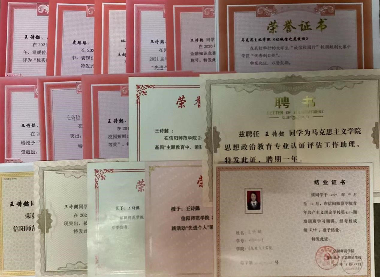 在学习方面,该生勤奋刻苦,善于思考,坚持练就过硬本领,努力提高科学文化水平,时刻把学习当作自己的第一任务,积极投入到各门基础课和专业课的学习中,并不断提高自身写作能力,积极撰写《在抗疫中书写奋斗青春》、《以高尚人格增添思政课教师魅力》等文章,并在《南湖评论》上发表。2019-2020学年荣获校级三等奖学金,顺利通过英语四级考试、普通话水平测试。不仅注重专业知识学习,而且注重提升综合能力,积极参加广播体操比赛、微团课比赛、南湖理论研讨社主题征文活动、学生会夜跑活动、“丹青墨韵”摄影美术作品大赛、仁杰工作室笔锋征文活动,参演了新生联谊晚会和2020年元旦晚会。2019年,参加学院“诚信校园行”校园短剧比赛中,荣获一等奖;2020年,参加法学与社会学学院手帐比赛获得二等奖;参加计算机学院“疫中成长分享你我的故事”比赛中获得手账组二等奖;参加金年会jinnianhuicom“诚信伴我行”线上金融征信知识竞赛获得二等奖;2021年,参加信阳师范学院“拼贴手账,我手秀我型”活动,荣获“三等奖”;参加“莘莘学子学四史,同心向党迎华诞”主题活动,被评为“优秀工作者”;被评为信阳师范学院2021年度三好学生。
