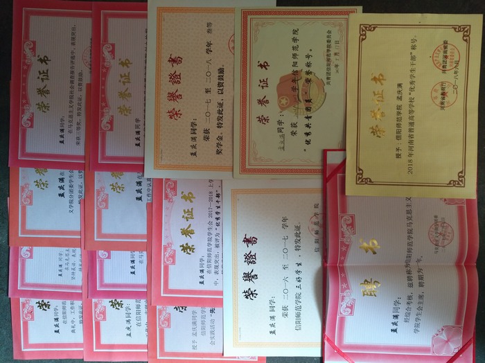 该生在担任学生干部期间能够以自身行动践行一名学生干部的职责,积极服务他人、奉献他人,得到师生一致好评。在学习方面该生积极努力,在2016至2017学年获得信阳师范学院校级三等奖学金,2017至2018学年获得信阳师范学院校级一等奖学金。同时积极参与课外实践活动,代表学院参加运动会、雷速杯、谭山杯篮球赛等活动。在校期间曾获河南省普通高等学校“优秀学生干部”、信阳师范学院三好学生、信阳师范学院模范干部、信阳师范学院优秀共青团员、信阳师范学院模范团干部、信阳师范学院“优秀学生干部”、信阳师范学院“暑期三下乡先进个人”等称号。