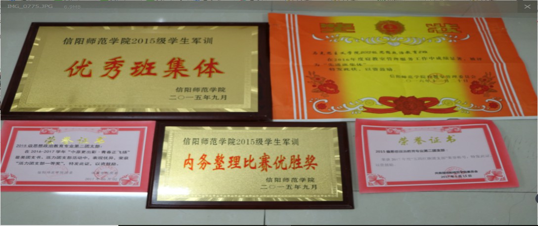 工作上,2015新生军训期间,被选为班长,在职期间积极配合学校学院工作,和班委一起管理班级事务。在军训表彰大会中获得“优秀班集体”,“内务整理优胜奖”等奖项;在2016-2017上半学年先后荣获信阳师范学院“先进班集体”和寝教室管理“先进班集体”;2016-2017下半学年先后获得信阳师范学院“五四红旗团支部”和“中原最出彩,青春正飞扬”活力团支部一等奖等各项荣誉;在2018年5月获得河南省“先进班集体”。2017年3月份被选为信阳师范学院校团委仁杰工作室技术部部长,并在校团委老师的带领下努力工作;2017年9月份又被选为2017级思想政治教育二班班主任助理,将经历和收获传递给新一届学生们。
