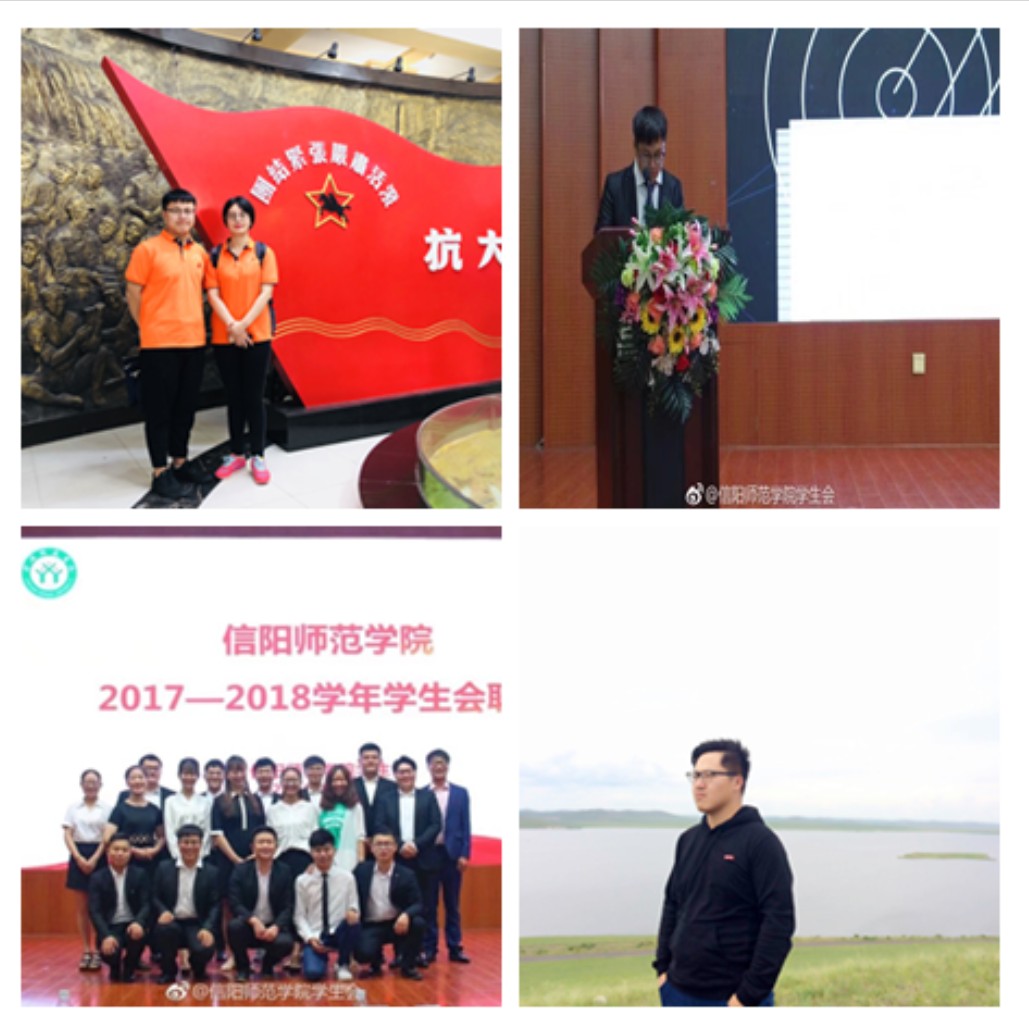 该生始终保持着积极的热情、坚定的信念和强烈的责任心,在2016年9月至2017年9月期间任金年会jinnianhuicom秘书处、生活劳卫部、体育部干事;在2017年9月至2018年3月期间任金年会jinnianhuicom新闻文艺部副部长,举办“喜迎十九大,共筑中国梦”书法绘画大赛;带领金年会jinnianhuicom广播体操队伍在2017年广播操比赛中取得二等奖的好成绩。2018年3月至今任金年会jinnianhuicom分团委学生会主席,协助团委老师处理各项学生事务,建立健全金年会官网学生与老师沟通与交流的良性渠道。作为一名学生干部,他始终以最高的标准严格要求自己,在工作中勤勤恳恳、认真负责。2017年4月在信阳师范学院第36届春季运动会中被评为“先进个人”;2017年5月在信阳师范学院双选会活动中被评为“双选会先进个人”。