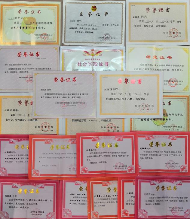 该生严格要求自己,2017、2018学年综合测评分别位于班级第八名、第六名;连续两年获得校级奖学金,并多次获得信阳师范学院“三好学生”、“模范干部”荣誉称号;注重科研探索,参与完成信阳师范学院大学生科研基金项目一般项目《习近平英雄情怀融入大学生理想信念教育路径探究》一项;于2018年暑假期间积极参与采访新郑市在南召县的招聘活动,参与《深化对口帮扶,拓宽就业渠道——南召-新郑举行就业对接招聘会》新闻稿件的摄像、写作,刊发在中国网、大河网等新闻网站;作为通讯员撰写《摆下“擂台赛”,聚力促发展》新闻稿件发表在《南阳日报》、《决策探索杂志》等。