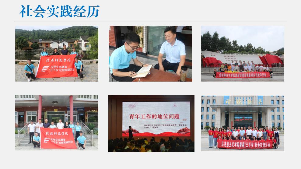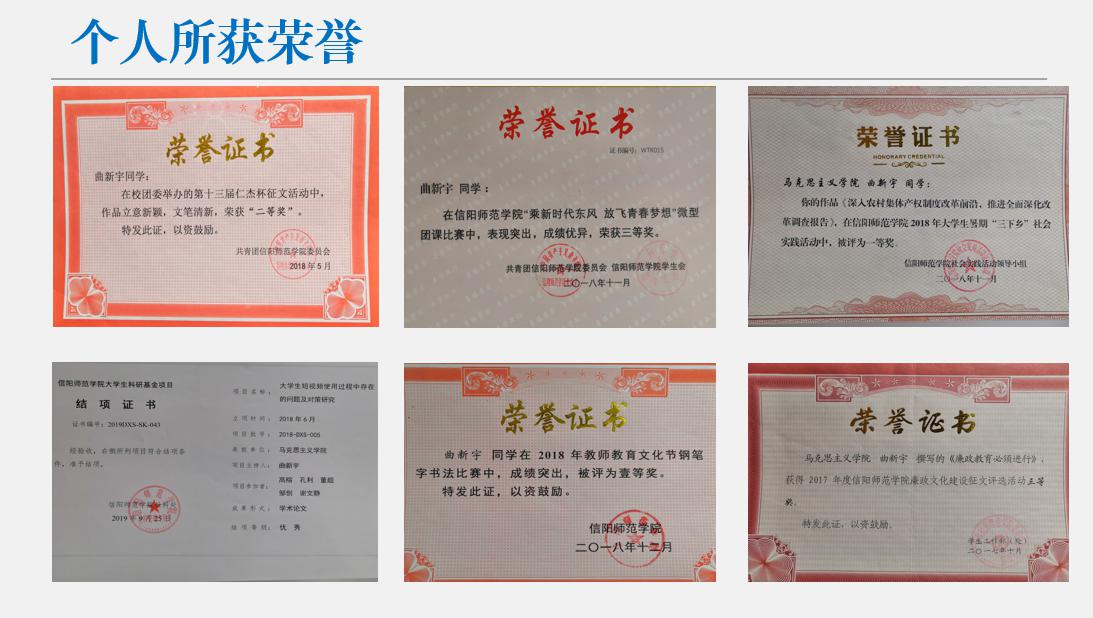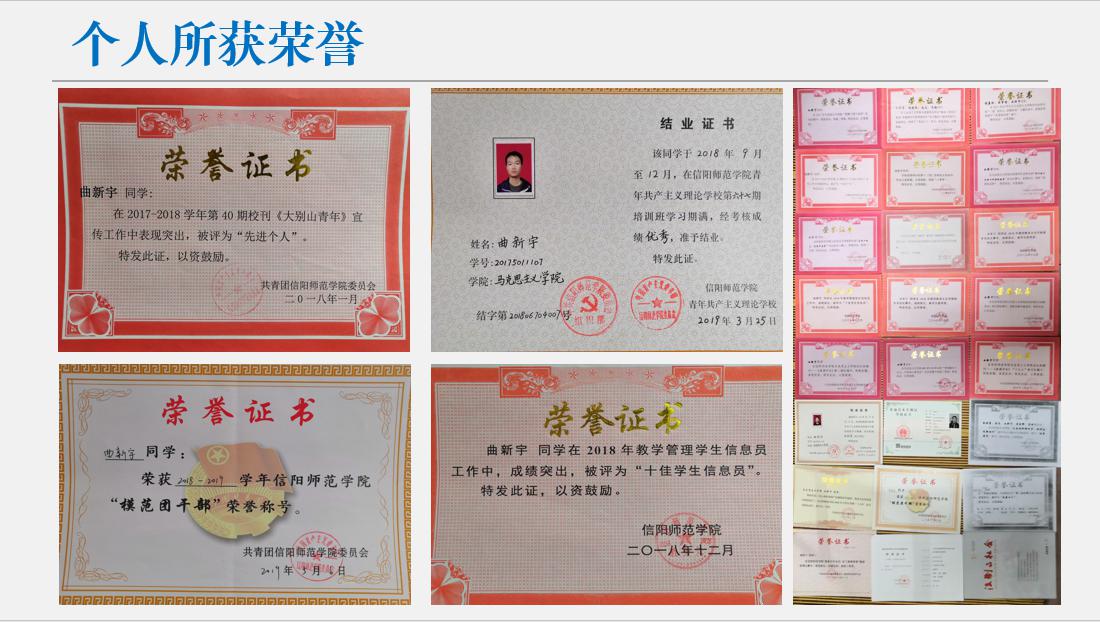 2019-2020年度,该同学坚定理想信念,接续砥砺奋进,顺利完成第六十七期青校培训并以优秀成绩顺利结业。在2019级新生报到工作中积极参与并担任2019级思想政治教育一班班代,协助班主任工作;在第三十二期党员发展对象培训班当中担任院系组长。该同学在本年度获得信阳师范学院模范团干部称号,2019年9月,该同学主持获批的大学生科研积极项目以优秀成绩顺利结项,并在CN刊物发表期刊论文,被中国知网收录。