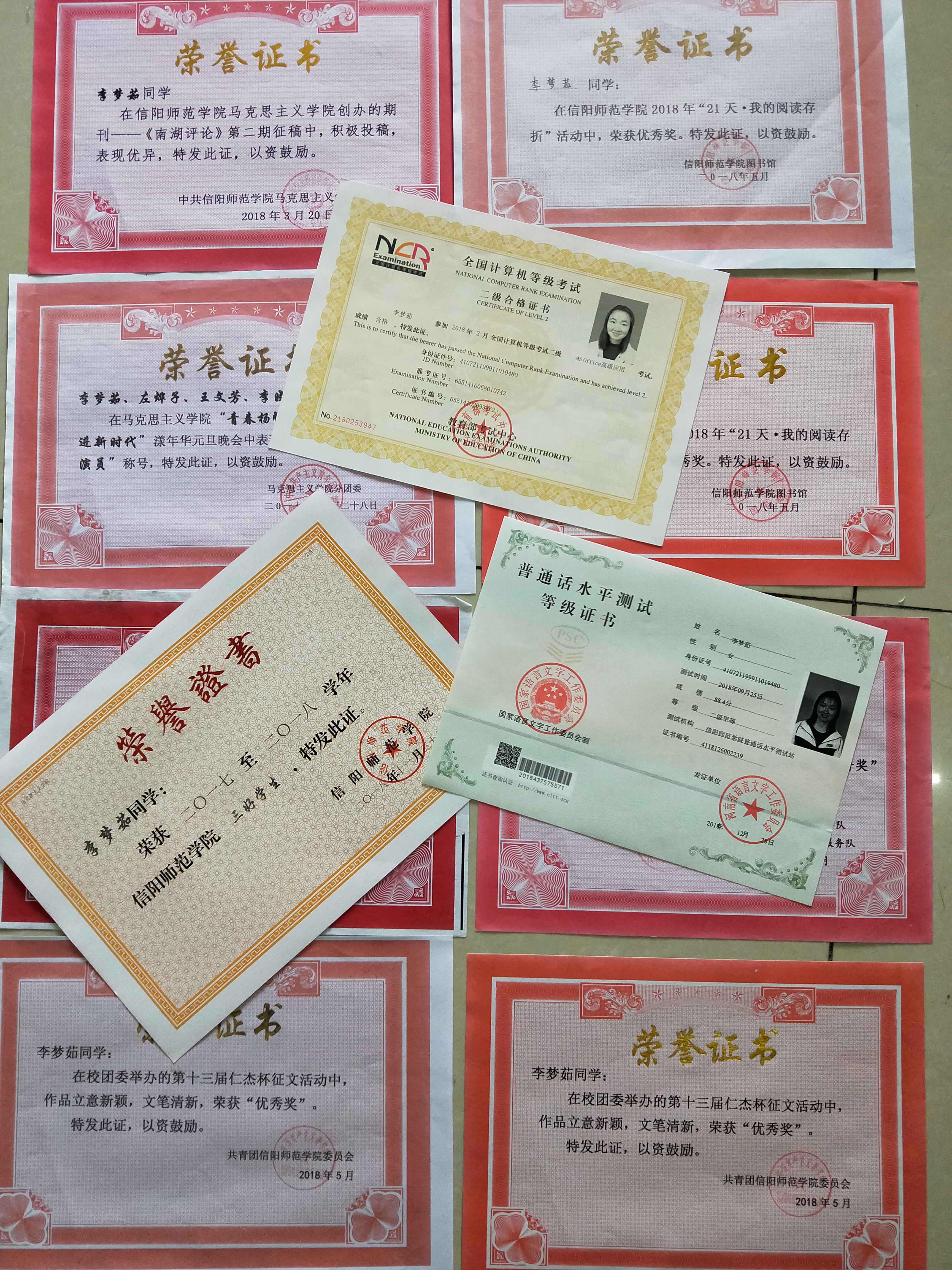该生作为一名思想政治教育专业学生,坚决拥护党的指导思想,关注时事,不断提高思想觉悟,努力学习专业知识,及时革新学习方法,学习勤奋刻苦,成绩优异,先后获得国家奖学金和校级一等奖学金。该生积极参加科研活动和社会实践活动,参与的科研基金项目顺利立项,社会实践调研报告在学院评比中荣获二等奖,并在《南湖评论》和《知行·南湖》中发表多篇文章。作为宣讲交流团的成员深入信阳市各个地区宣讲习近平新时代中国特色社会主义思想,同时也在“讲好河南故事,演绎中原风采”英语演讲比赛中荣获三等奖,多次荣获信阳师范学院三好学生。