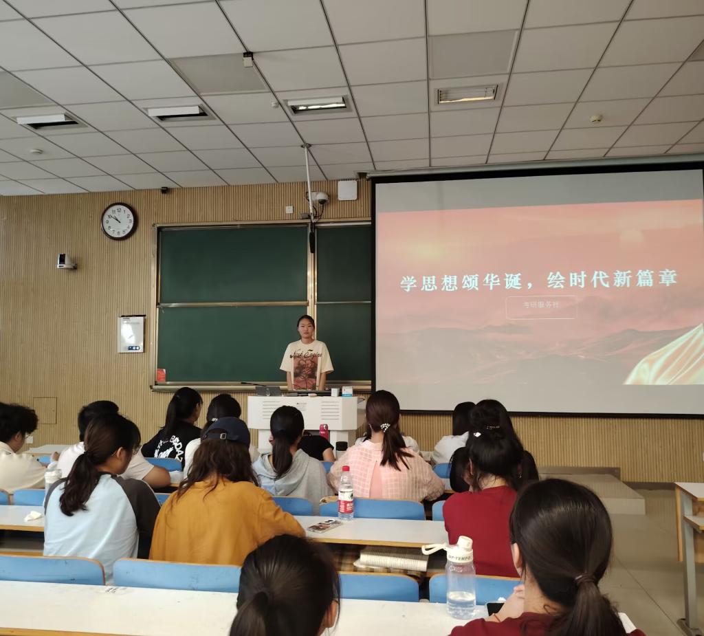 为深入学习和传承中国特色社会主义思想,激发学生的爱国热情和社会责任感,实现中华民族伟大复兴的中国梦贡献青春力量。9月29日,考研服务社于社科楼515开展了“学思想颂华诞,绘时代新篇章”主题团日活动。本次活动由社长丁文倩主持,考研服务社全体社员参加。