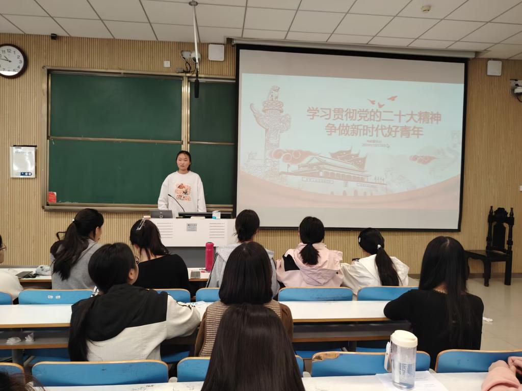 活动伊始,社长丁文倩介绍了党的二十大报告的主要内容和历史背景,展示了过去五年和新时代十年党领导人民取得的伟大成就,以及新时代新征程中国共产党的使命任务。接着,团支书冀艺婷讲解了党的二十大精神的内涵,带领社团成员们深入理解党的二十大的核心要义和实践要求,进而增强社团成员的凝聚力、指导其行动方向。随后,团支书冀艺婷通过PPT展示和现场讲解的方式,深入解读了党的二十大报告的主要内容和精神实质,阐述了新时代青年的责任和使命,引导青年团员们要坚定理想信念、锤炼品德修为、练就过硬本领。