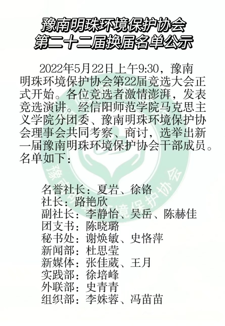 5月22日上午,豫南明珠环境保护协会换届竞选大会在社科楼515教室顺利举行。社团社长、团支书、各部部长及21级竞选人共同参加了此次会议。会议由社长夏岩主持。