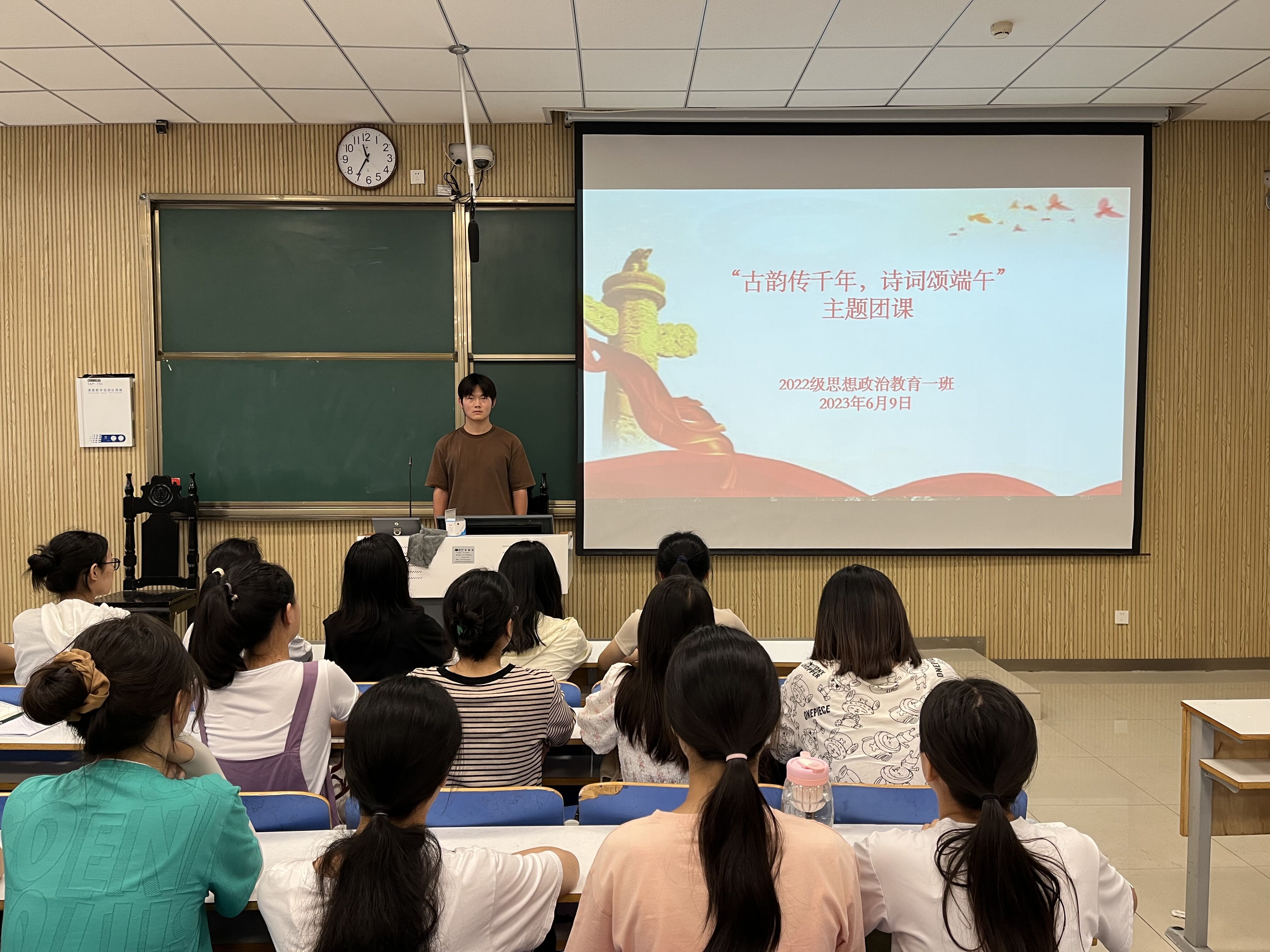 为进一步弘扬中华民族优秀传统文化,发挥传统节日在加强思想建设中的作用,6月9日上午,金年会jinnianhuicom2022级思想政治教育一班在社科楼515教室召开“古韵传千年,诗词颂端午”主题团课,2022级思想政治教育一班全体同学共同参与本次团课,团课由团支部副书记闻炎仲主持。