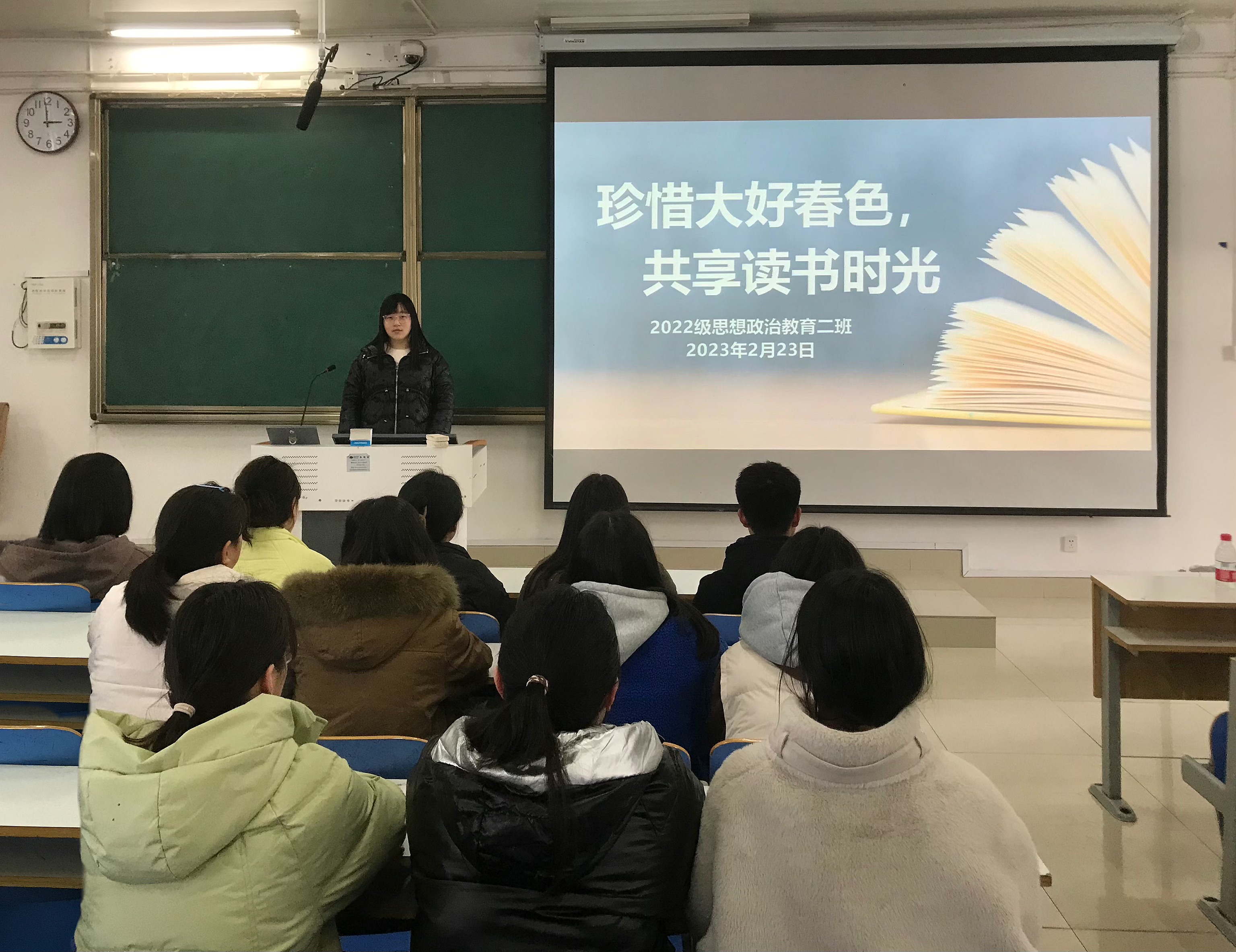 春光明媚好读书,墨韵飘香沁心扉。2月23日下午,金年会jinnianhuicom2022级思想政治教育二班在社科楼514教室召开“珍惜大好春色,共享读书时光”主题班会。2022级思想政治教育二班全体同学共同参加会议。班会由班长李佳音主持。