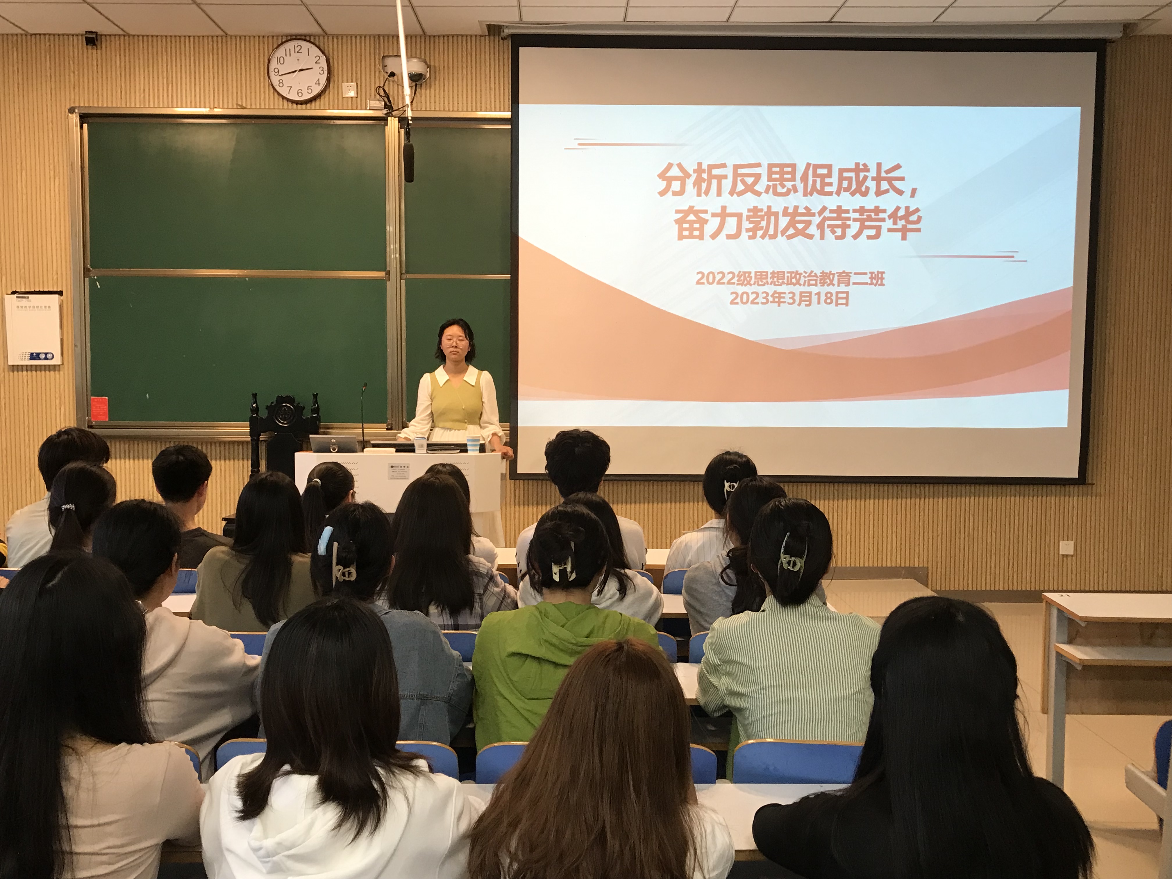 在学习中成长,于反思中进步。3月18日下午,金年会jinnianhuicom2022级思想政治教育二班在社科楼515教室召开“分析反思促成长 奋力勃发待芳华”主题班会。2022级思想政治教育二班全体同学共同参加会议。班会由学习委员谢佳邑主持。