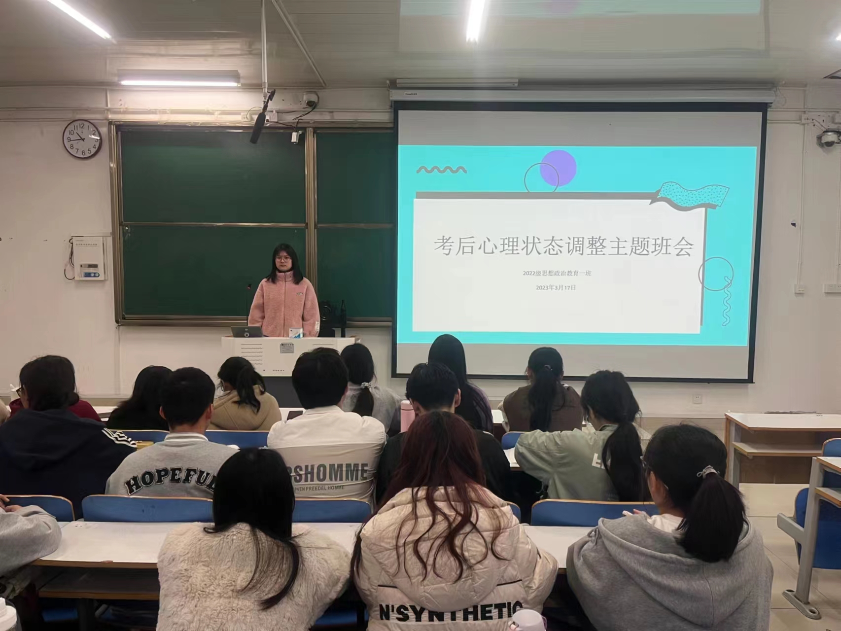 为做好考后心理调适工作,带动同学们更好地投入新学期学习,3月17日上午,金年会jinnianhuicom2022级思想政治教育一班在社科楼514教室召开“考后心理状态调整”主题班会。2022级思想政治教育一班全体同学参与本次班会,班会由心理委员马思源主持。