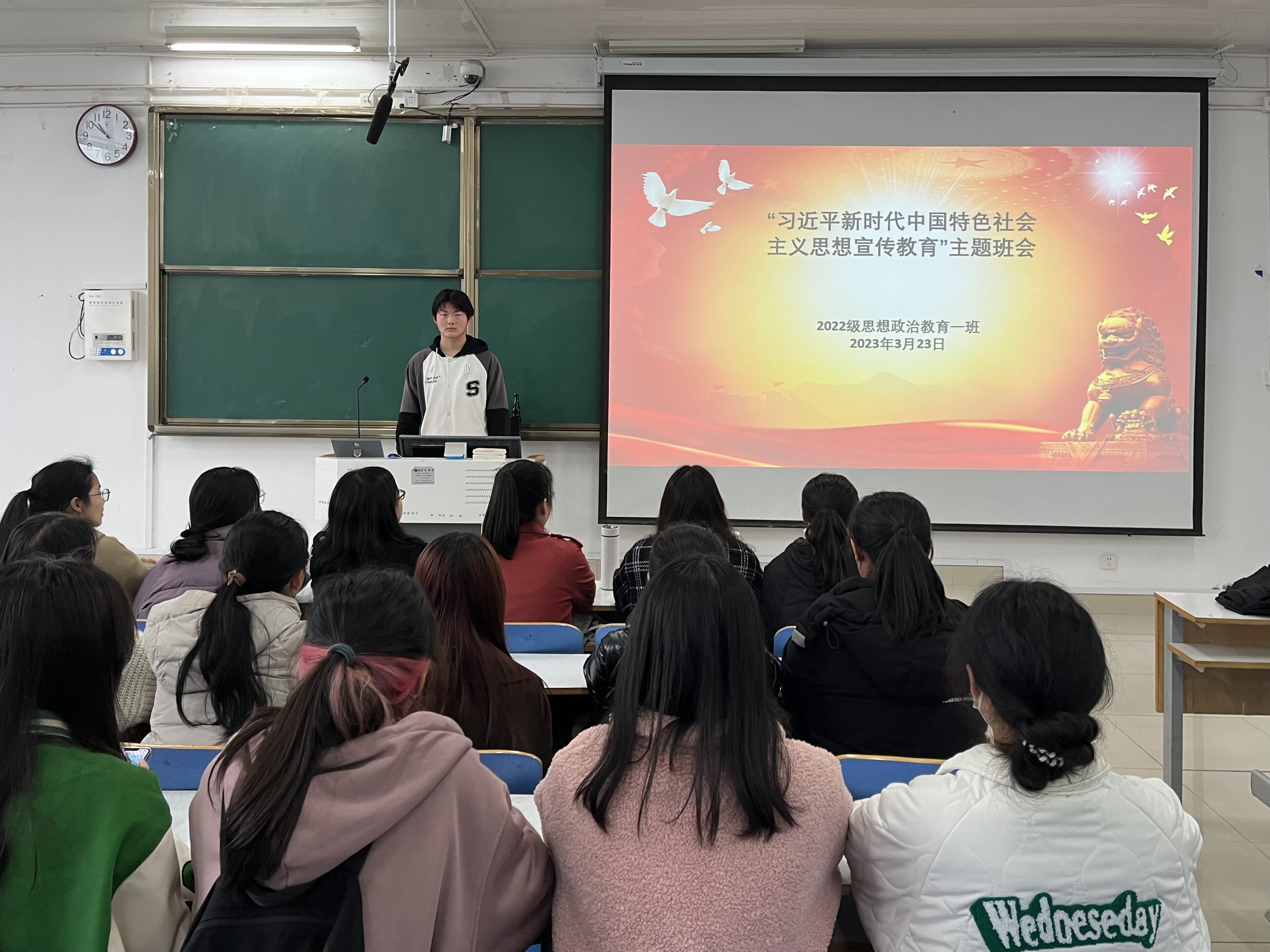 为加强理论学习,更好推进思想教育工作,3月23日上午,金年会jinnianhuicom2022级思想政治教育一班在社科楼514教室召开“习近平新时代中国特色社会主义思想宣传教育”主题班会。2022级思想政治教育一班全体同学共同参与本次班会,班会由副班长闻炎仲主持。