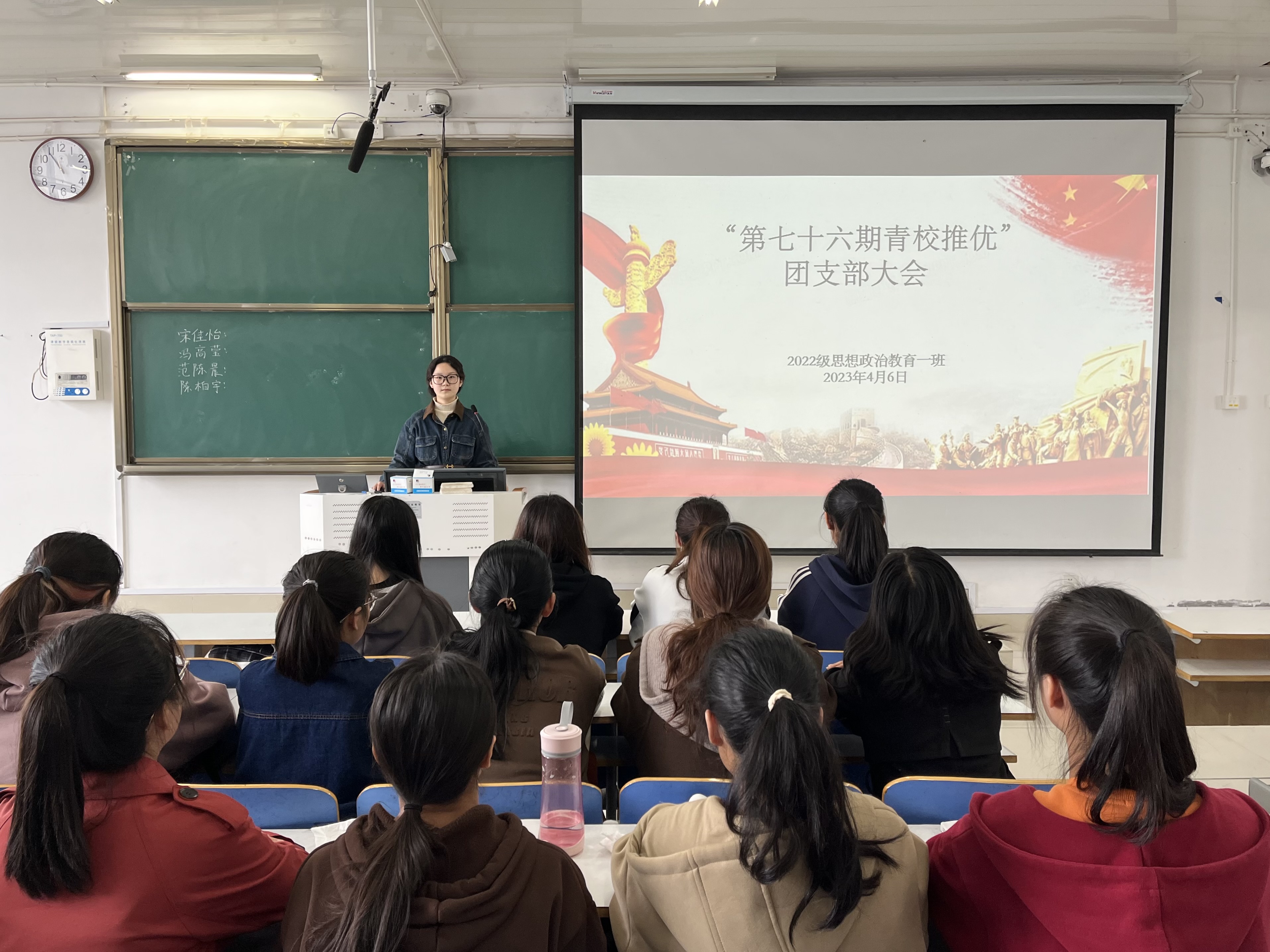 为选出第七十六期青校推优人员,进一步推进团支部工作,4月6日上午,金年会jinnianhuicom2022级思想政治教育一班在社科楼514教室召开“第七十六期青校推优”团支部大会。2022级思想政治教育一班全体团员参与本次会议,会议由团支书李佳茹主持。