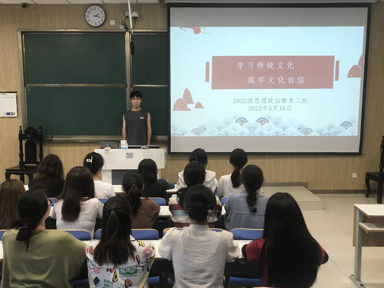 为深入贯彻落实党的二十大精神,进一步传承和弘扬中华优秀传统文化,5月16日下午,金年会jinnianhuicom2022级思想政治教育二班在社科楼515教室召开“学习传统文化,筑牢文化自信”主题班会,2022级思想政治教育二班全体同学共同参加。班会由副班长柴智森主持。