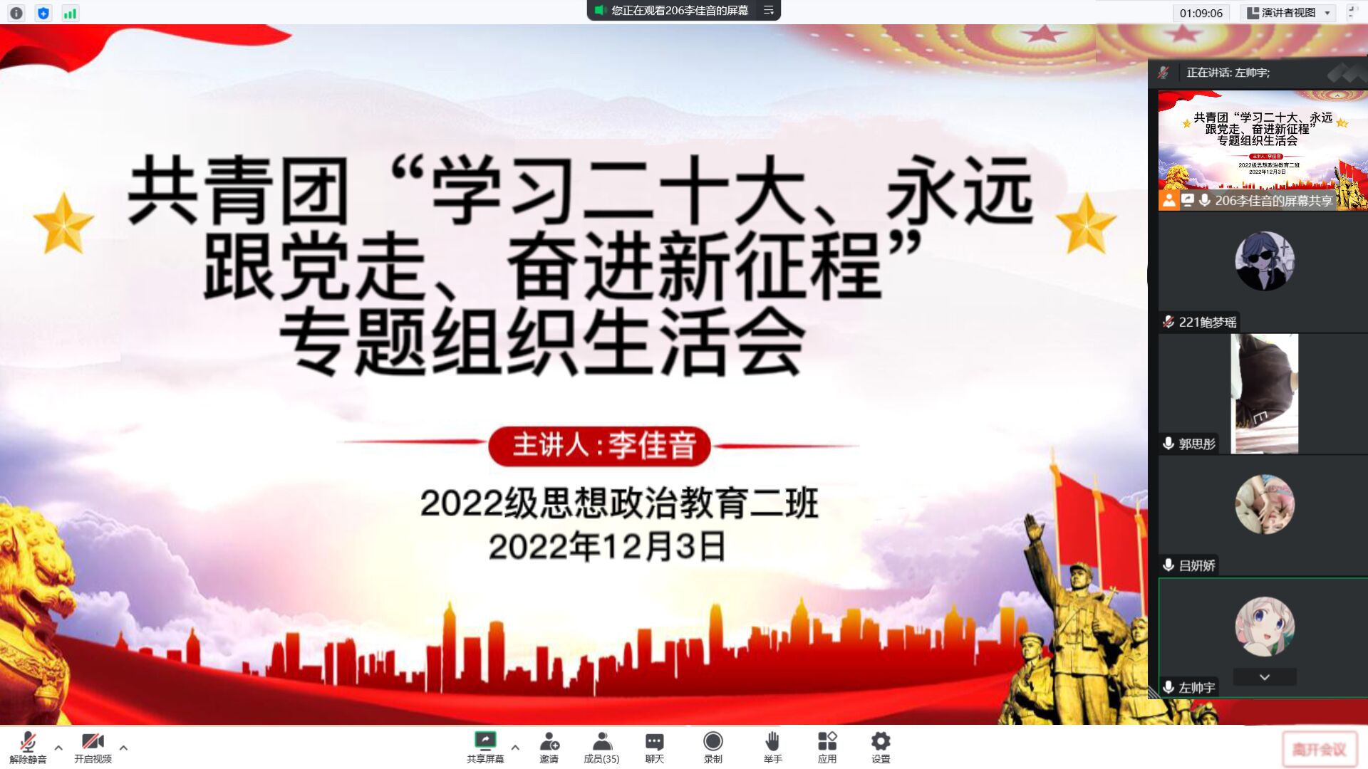 为深入学习贯彻党的二十大精神,加强基层团组织建设,12月3日晚上,金年会jinnianhuicom2022级思想政治教育二班于线上召开共青团“学习二十大、永远跟党走、奋进新征程”专题组织生活会。2022级思想政治教育二班全体共青团员共同参加会议。本次会议由团支书李佳音主持。