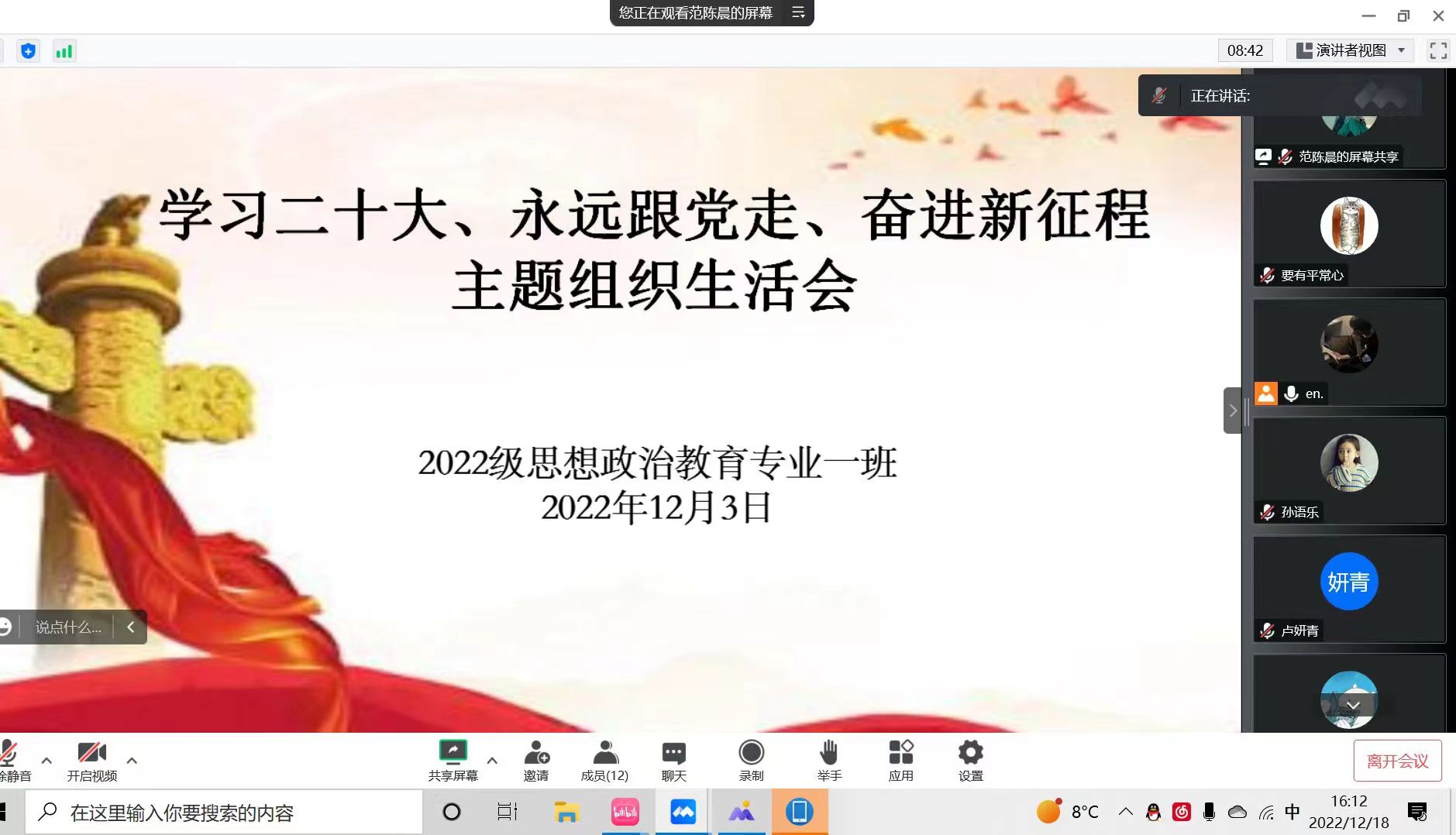 为深入学习贯彻党的二十大精神,加强团支部思想建设,12月3日下午,金年会jinnianhuicom2022级思想政治教育一班在线上召开“学习二十大,永远跟党走,奋进新征程”主题组织生活会。2022级思想政治教育一班班主任王明园和团支部全体成员参与本次会议,会议由团支部书记李佳茹主持。